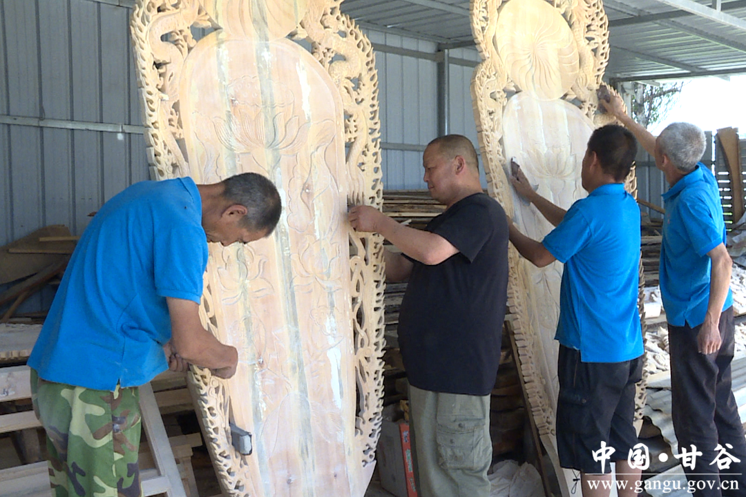走进位于甘谷县磐安镇四十铺的神艺木雕厂,满眼皆是摆放一地的木雕成品和半成品,空气中更是弥漫着木头特有的清香。身为师傅的宋伟强在指导徒弟之余,依旧会一手扶木,一手拿着刻刀,站在木料前打坯、抛光,凿子、锉子、刻刀……宋伟强手中不停变换着工具,木屑一片片滑落,但他沉浸其中,不放过丝毫细节。