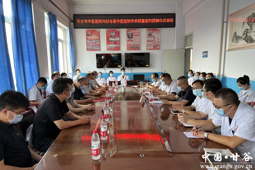8月12日,“科创中国”中医药基层科技工作者交流活动暨天水市中医医院与甘谷县中医医院专科联盟签约授牌仪式在甘谷县中医医院五楼会议室举行。天水市中医医院党委书记王志刚讲话,副县长刘强致辞,甘谷县中医医院党支部书记、院长任爱理主持仪式。