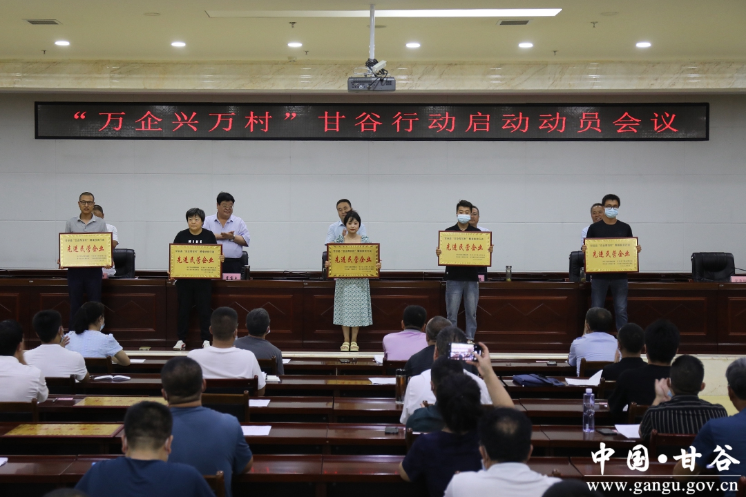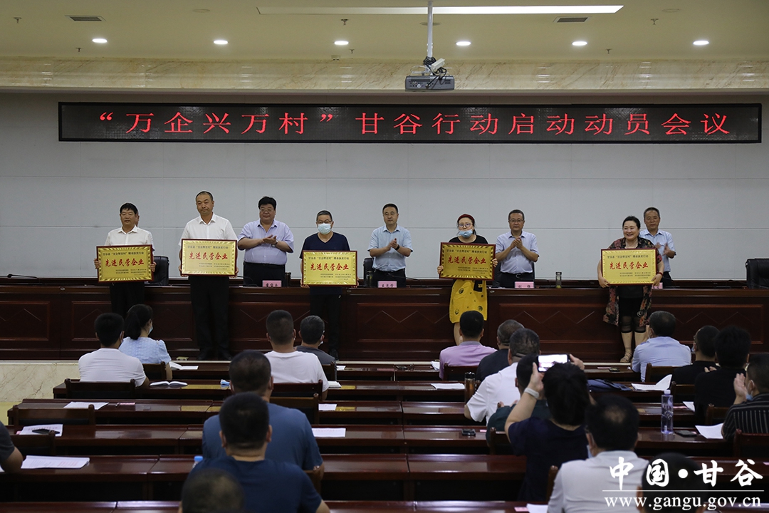 会议宣读了《“万企兴万村”甘谷行动实施方案》和《关于甘谷县“百企帮百村”精准扶贫行动中做出突出贡献的民营企业进行表彰决定》,表彰了在甘谷县“百企帮百村”精准扶贫行动中做出突出贡献的民营企业,签订了《“万企兴万村”甘谷行动结对帮扶协议》。