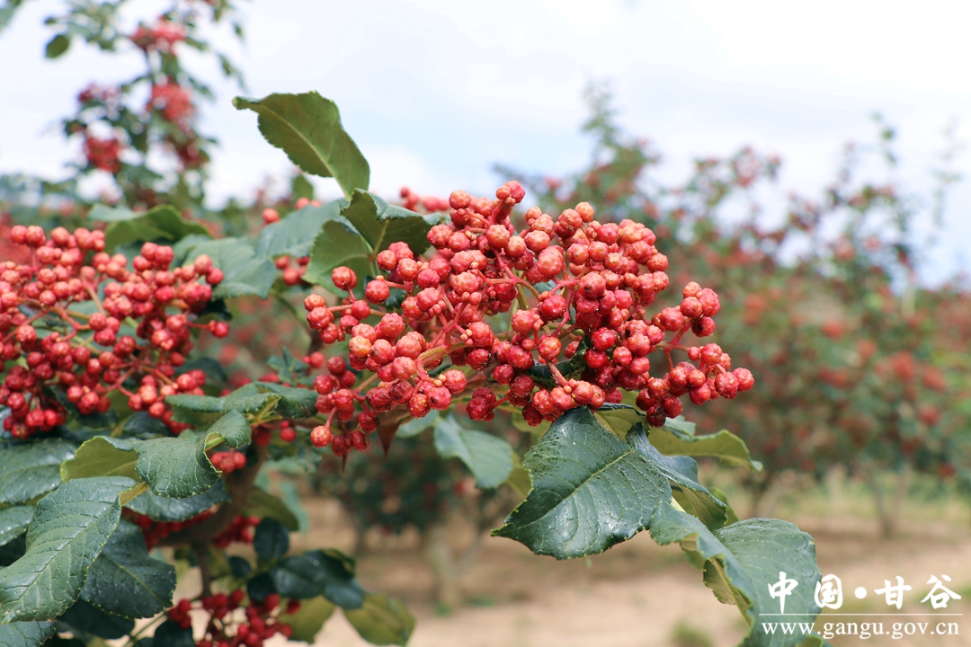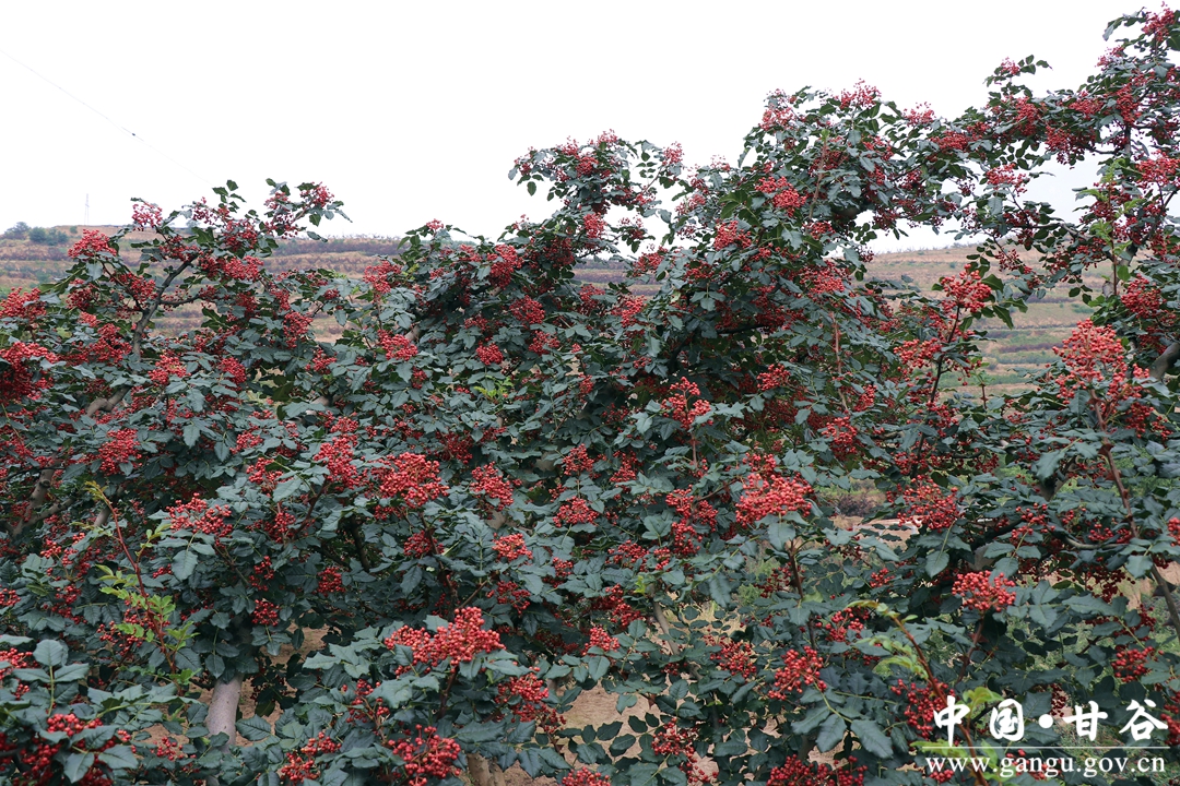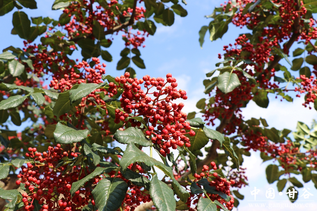 花椒是白家湾乡支柱产业之一,也是“椒区”农户增收致富的主要来源。在白家湾乡安家湾等村的花椒基地,鲜红油亮饱满的“大红袍”花椒挂满枝头,微风拂过椒香扑鼻,田间随处可见椒农采椒的丰收景象。此时“雇主”赵瑞军正带着工人在一片红绿的椒园中采摘花椒。