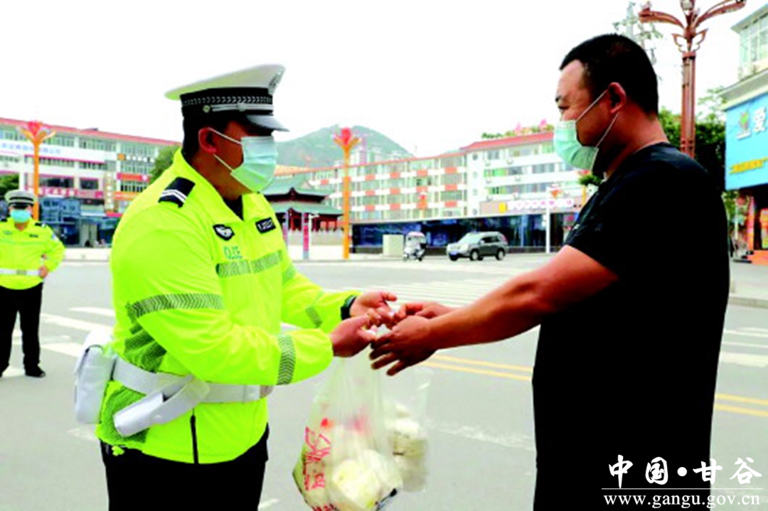7月18日中午,甘谷县一餐饮店负责人廖尊贤和员工将200份肉夹馍送到了各疫情防控劝导执勤点,为疫情防控贡献自己的一份力量。