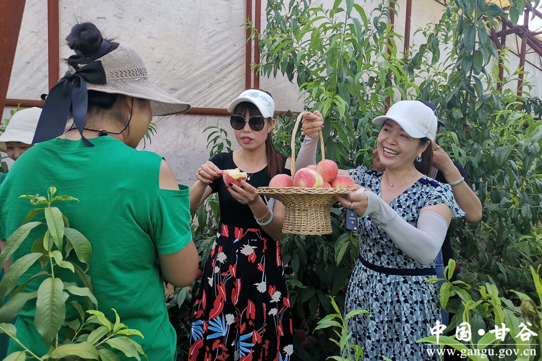 走进甘谷县果沣源农产品专业合作社蜜桃基地,大棚内一颗颗粉腮朱唇蜜桃藏于绿叶之下,经清晨的缕缕阳光照射,蜜桃显得晶莹剔透,招来阵阵游客入园采摘。采摘者孙芳霞说,你喜欢吃软糯一点的,可以挑选软糯一点的,喜欢吃脆甜一点的,可以摘点脆甜一点的,这个体验感是非常美好的,在路边买桃是找不到那种快感的。