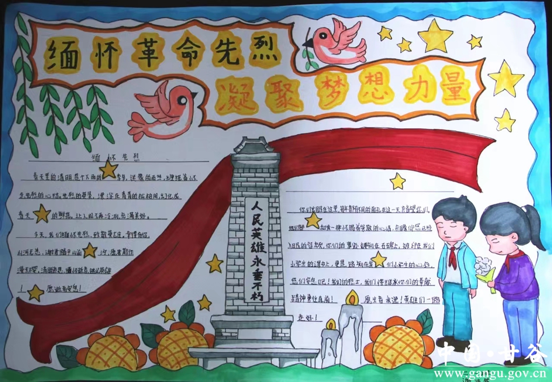 开展生态文明祭扫活动。甘谷县新兴小学开展了“缅怀革命先烈,凝聚梦想力量”的清明家校共育系列活动,通过主题手抄报、主题作文、亲子活动等多种形式,缅怀革命先烈,传承红色基因,弘扬中华民族精神。甘谷县大像山镇南街小学开展了“缅怀革命先烈,传承红色基因”为主题的系列实践教育活动,活动以国旗下演讲、红领巾广播站宣讲、主题队会、参观烈士纪念馆、聆听红色故事等多种形式,引导广大少先队员通过沉浸式教育、行走式体验“缅怀革命先烈·传承红色基因”汲取奋进力量。甘谷县金山镇金山小学举行“忆清明、缅英烈、 思奋进”主题活动,师生学习了金山籍革命烈士事迹。