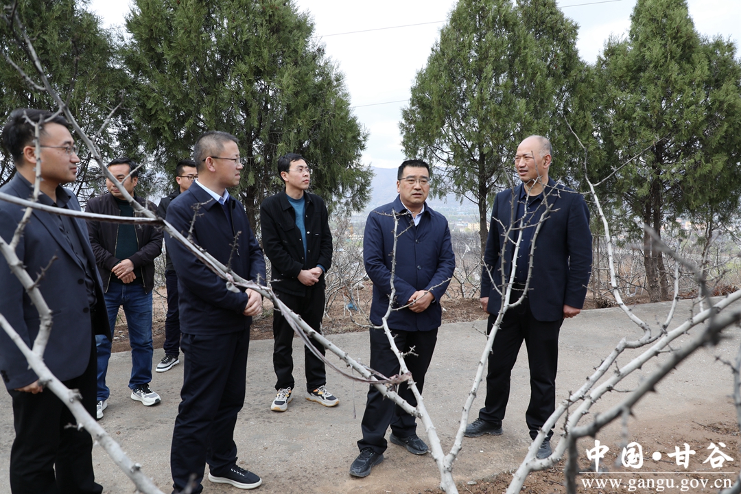 4月3日,县委副书记林如海、副县长金辉深入新兴镇、六峰镇等地果园,调研指导果园预防低温霜冻准备工作。