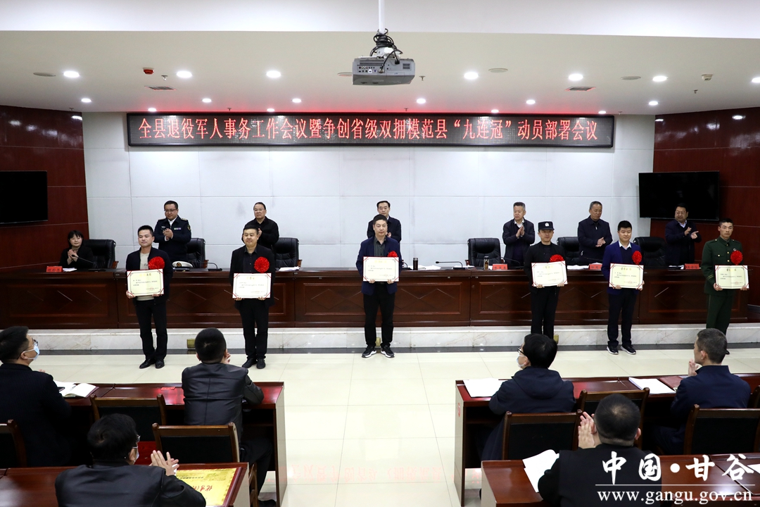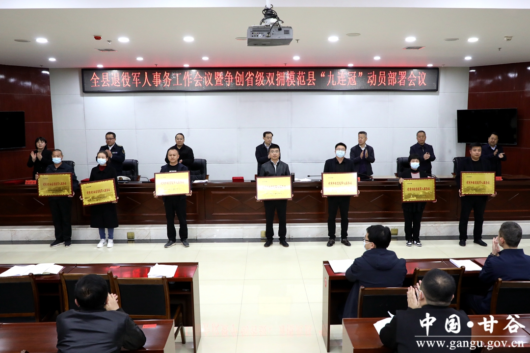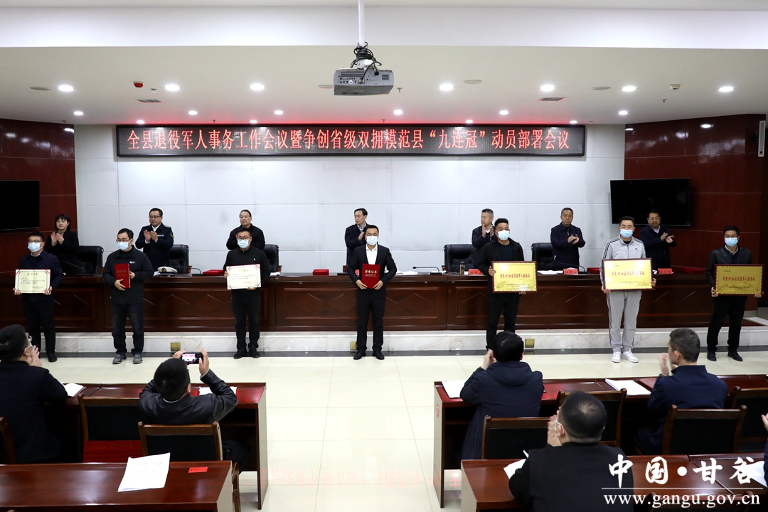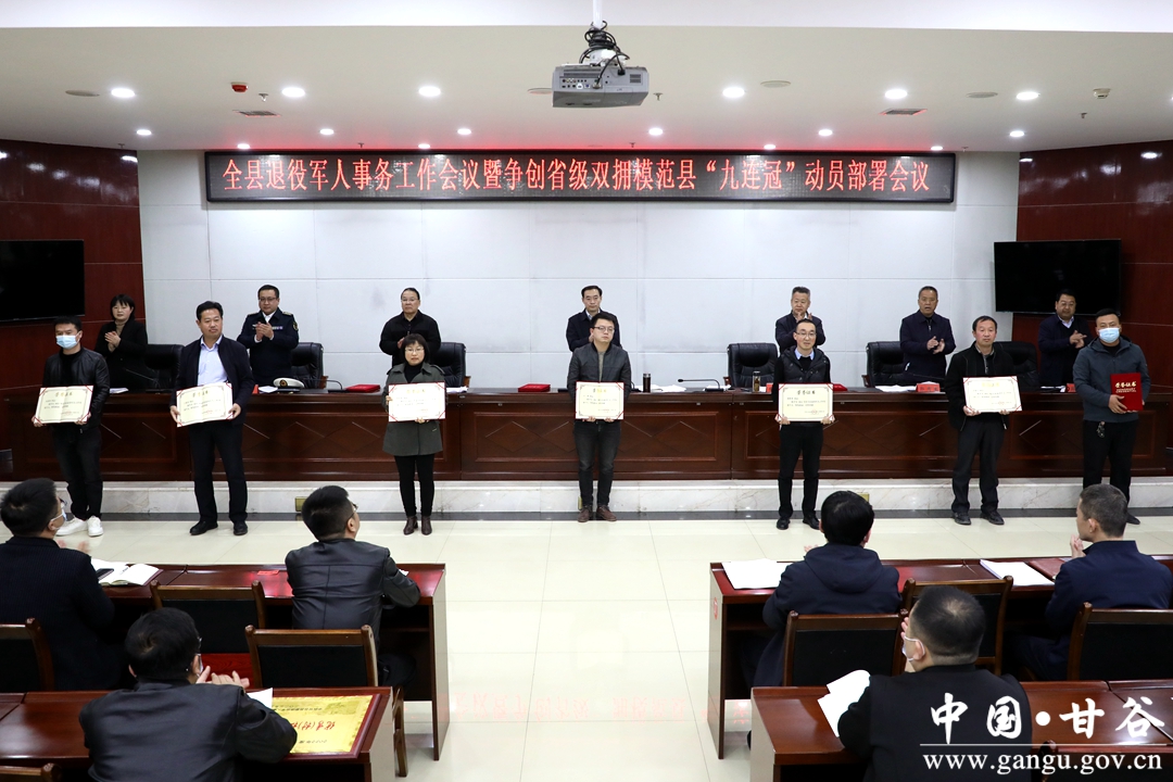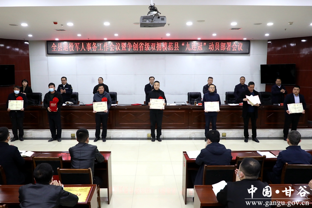 会议传达学习了全国退役军人事务厅(局)长会议、纪念延安双拥运动80周年座谈会、全国省(自治区、直辖市)双拥办主任会议、全国双拥办主任办公会会议、全省退役军人事务工作会议、全省双拥办主任会议、全市退役军人事务局长会议、全市双拥工作领导小组(扩大)会议精神;表彰了表彰了10个先进退役军人服务站和14名退役军人工作先进个人、10名最美退役军人。会上,县退役军人局党组书记蒋守信作工作报告,县退役军人局局长谢彩琴解读《甘谷县争创全省双拥模范县“九连冠”工作的实施方案》,大像山镇、新兴镇、县人社局、县融媒体中心、武警县中队作交流发言。
