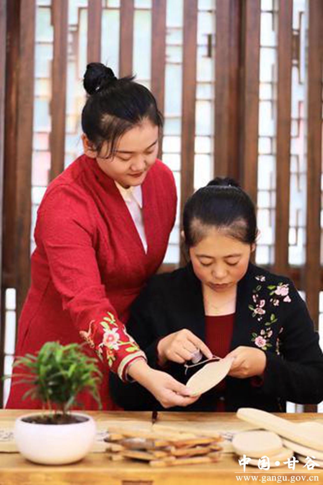 (郭娟(左)教人制作麻鞋)