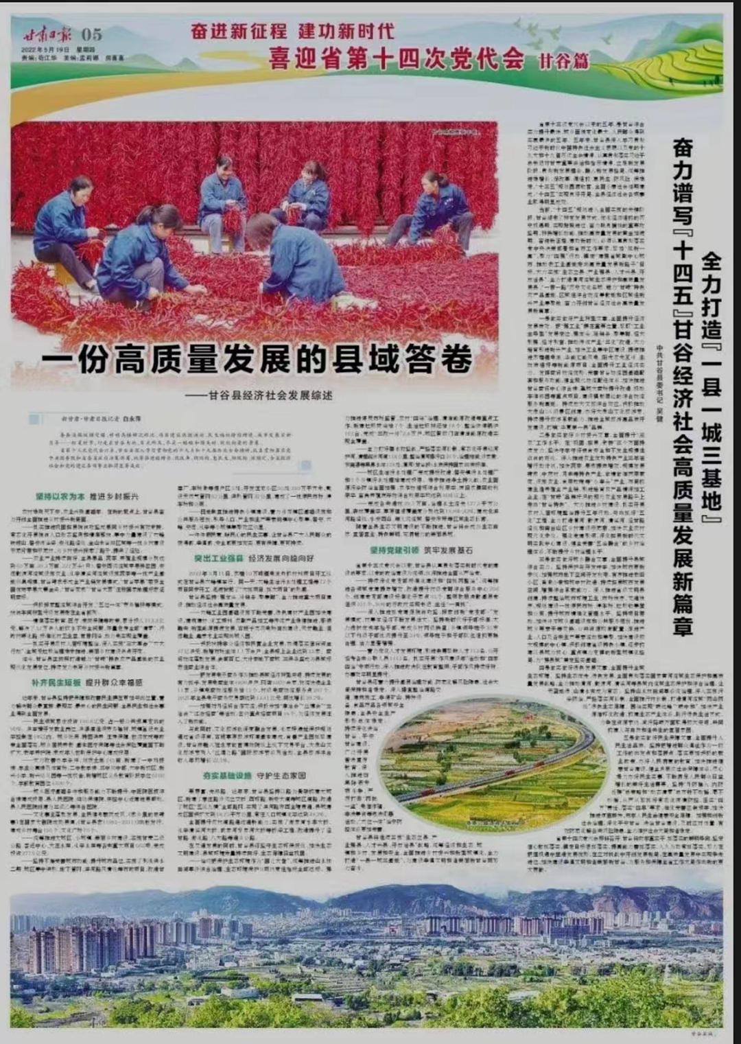 甘谷县将继续实施“生态立县、产业强县、人才兴县、开放活县”战略,统筹经济和生态、城镇和乡村、发展和安全,全面推进乡村振兴和新型城镇化,全力打造“一县一城三基地”,为建设幸福文明和谐美丽新甘谷而努力奋斗。