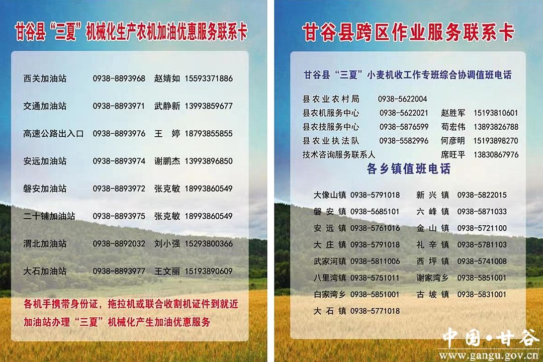 甘谷县农业农村局和交通、气象、石油、应急等部门成立了“三夏”专班,建立跨区作业服务站1个(县高速收费站),农机加油服务站8个(全县所有中石油加油站)。在跨区作业服务站对来甘谷参加“三夏”的跨区作业的车辆(机械)实施高速免费通行,并进行信息登记、发放农机作业安全资料、提供服务电话、农机加油优惠3%政策资料及《致参加2023年甘谷县小麦机收作业农机手的一封信》。同时在全县农机服务微信群等线上线下各平台对参与“三夏”农业生产的机手进行小麦机收减损、安全教育、优惠政策、检修服务等宣传。截止20日下午已登记来甘谷跨区作业机械4台,目前“三夏”工作正在有序推进中。