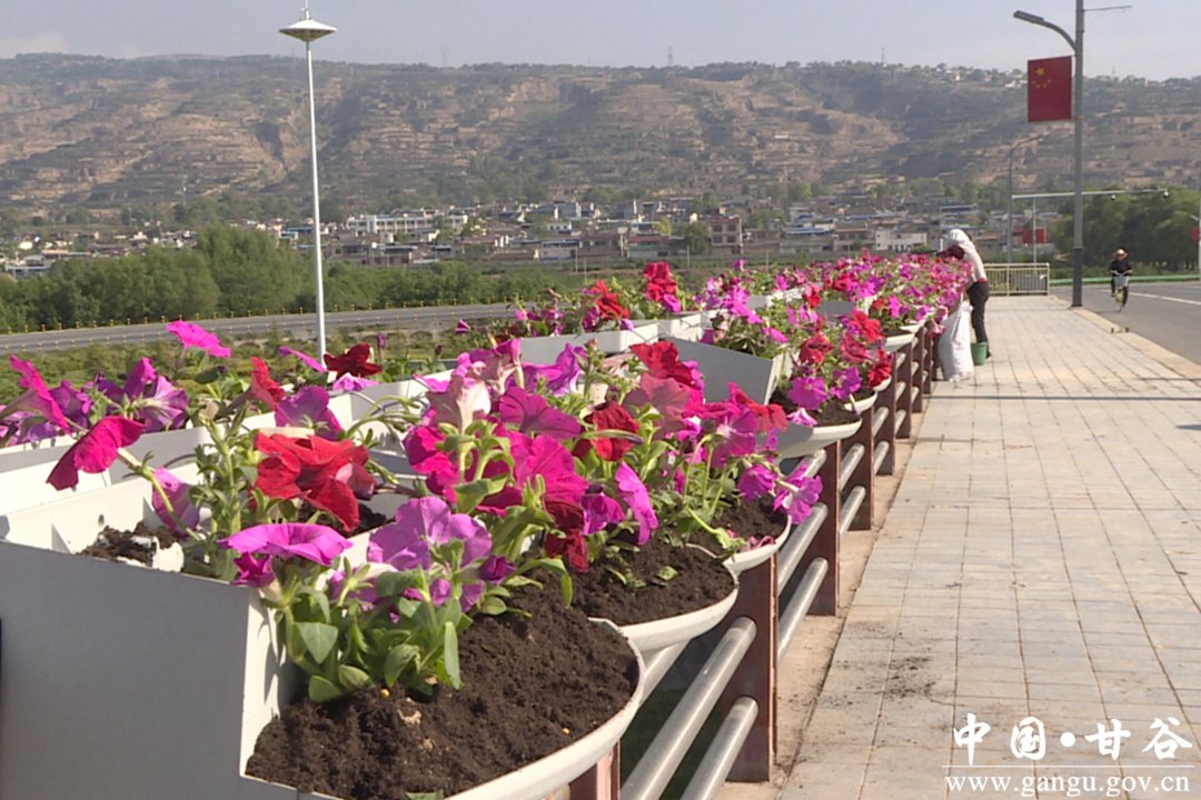 城区道路、桥梁养绿护绿工作正在如火如荼开展,在杨赵渭河大桥等重要桥段记者看到,工人们正忙着为护栏上的花盆中填土、栽植景观花卉,栽植好的牵牛花盆景花开正浓,花期可以持续到十月份;滨河路两岸月季、紫薇竞相绽放,石榴、冬青球等绿植绿意盎然。