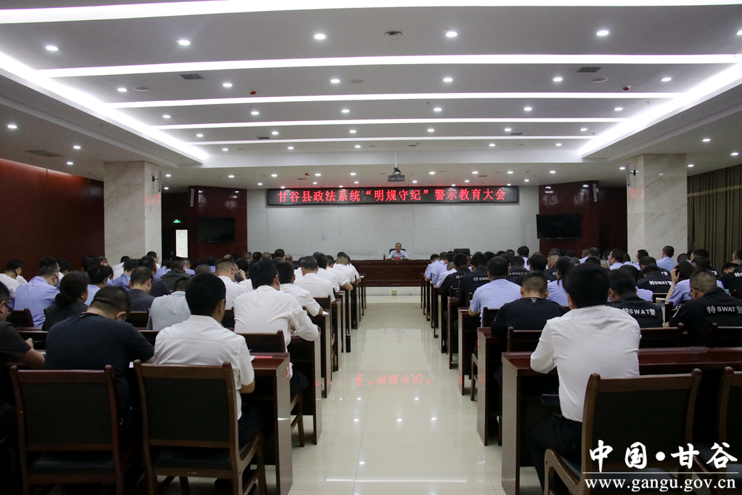 为深入学习贯彻习近平总书记关于全面从严治党重要论述,扎实开展“铸忠诚警魂”活动“明规守纪”专题教育,6月20日,甘谷县召开政法系统“明规守纪”警示教育大会,县委常委、县纪委书记、监委主任李万举作廉政报告。县委常委、政法委书记刘强主持会议,副县长、县公安局局长张涛,县法院院长李兰,县检察院检察长邵新建出席会议。县委政法委班子成员、全体干部;县政法各单位班子成员及股所队室负责同志;各乡镇政法委员,共计140余人参加会议。会上集体观看警示教育片《破防》。