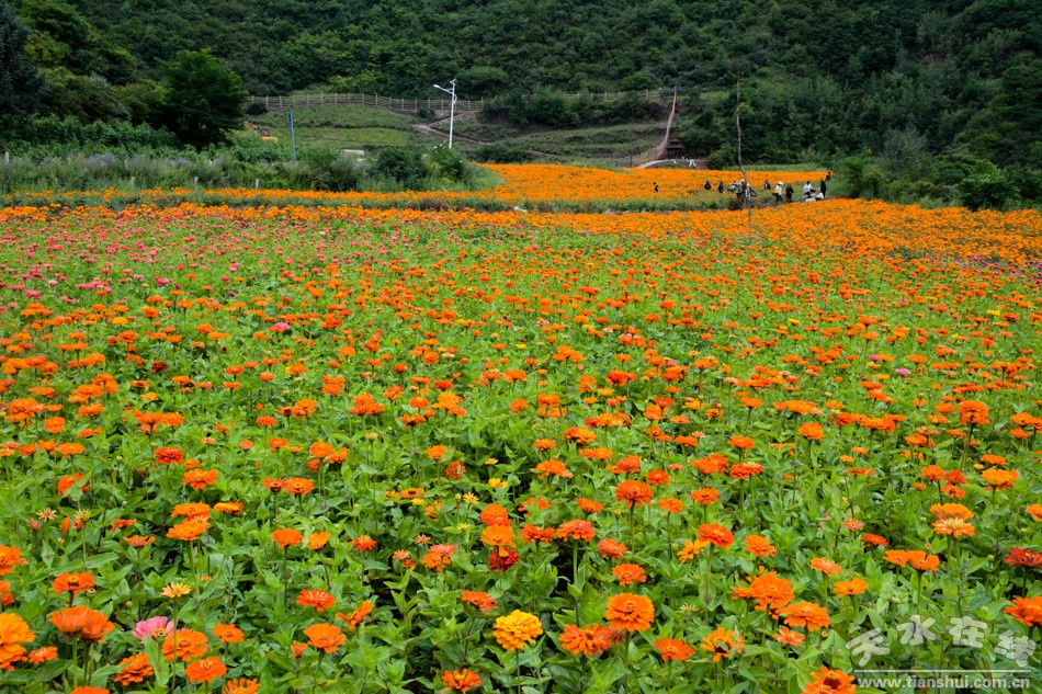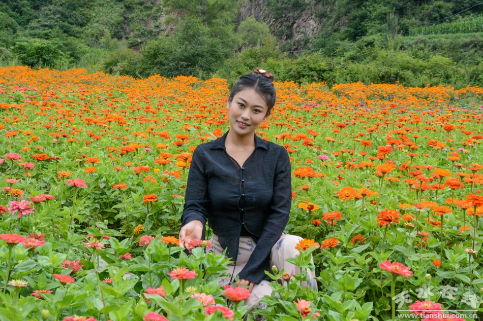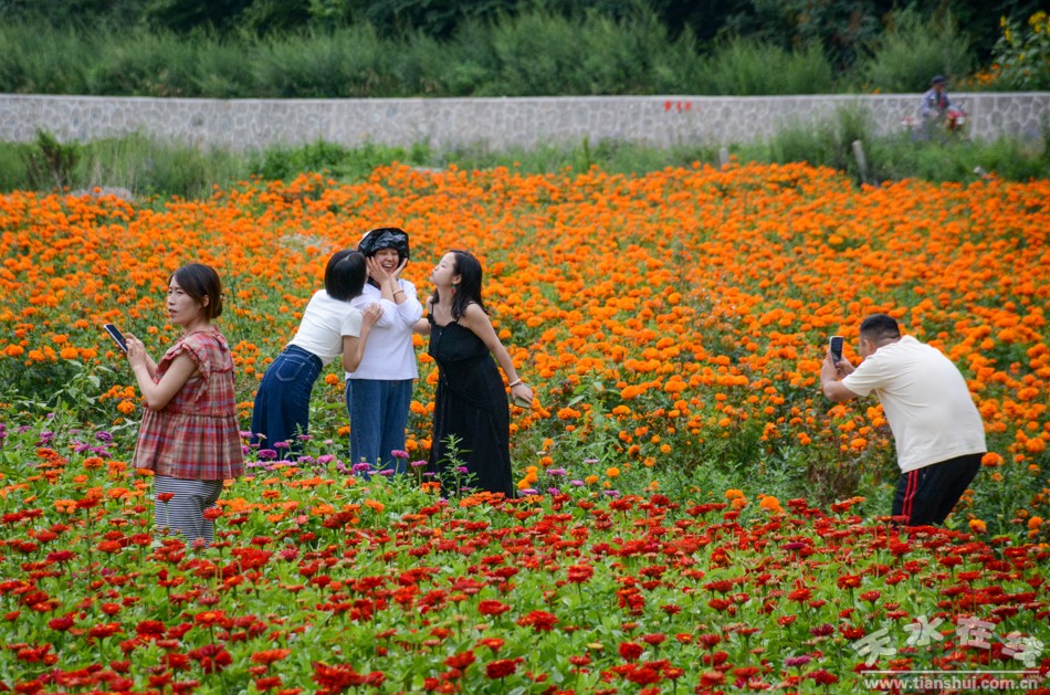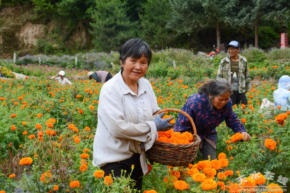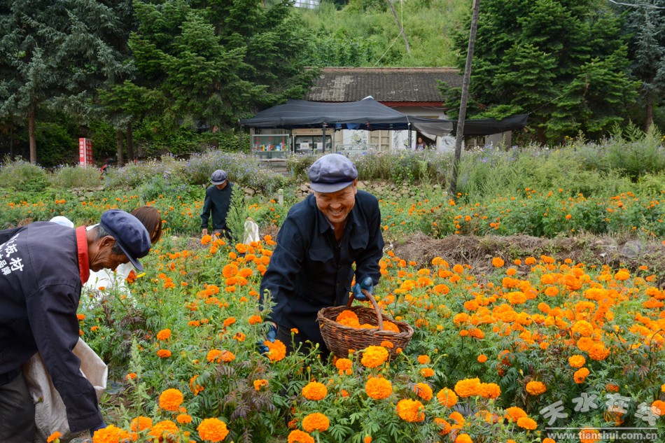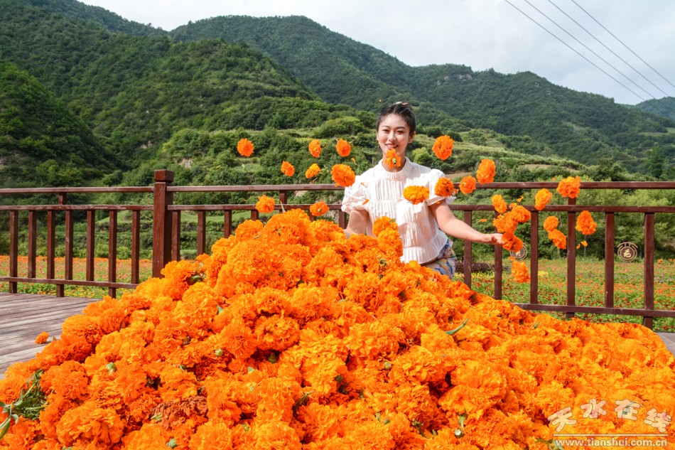 8月7日,天水在线主播萌萌一行来到甘谷县古坡镇大卜峪村万寿菊种植基地看到,这里的万寿菊已经竞相绽放、花开成海,开始采收。