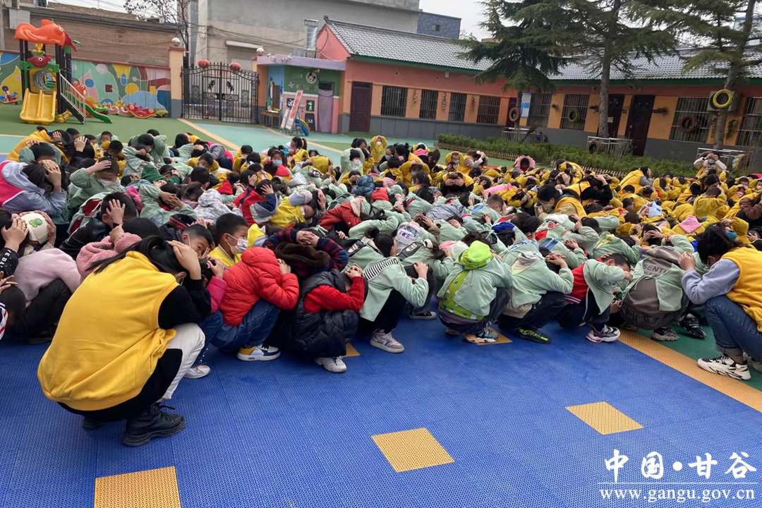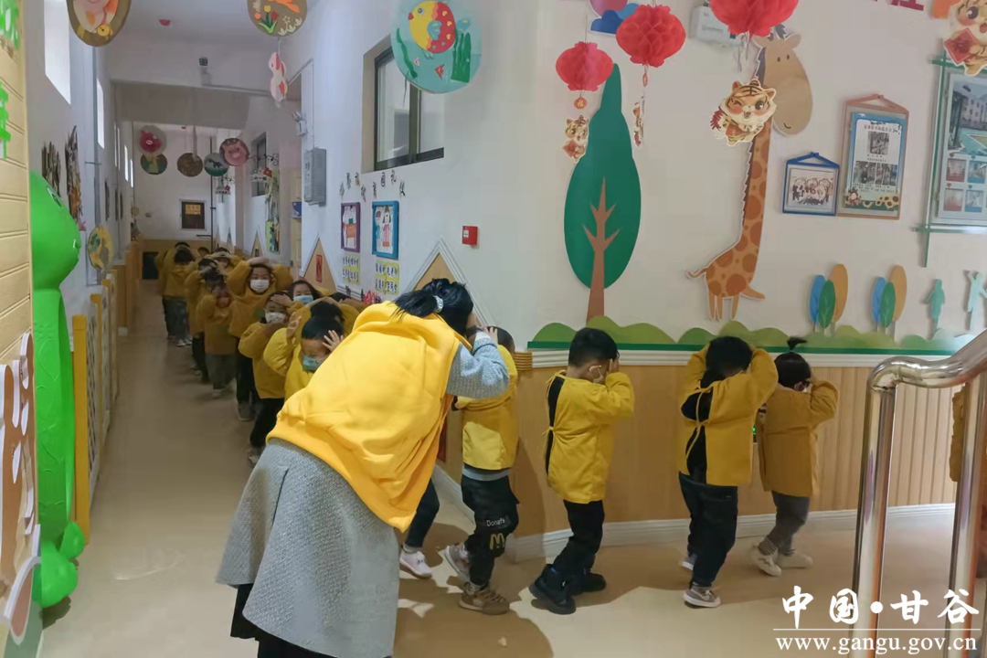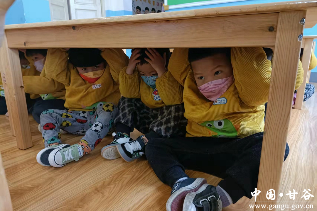 警报声响起,幼儿在教师组织下就近躲避,迅速蹲到坚固的课桌下、墙角处,用双手护住头部。