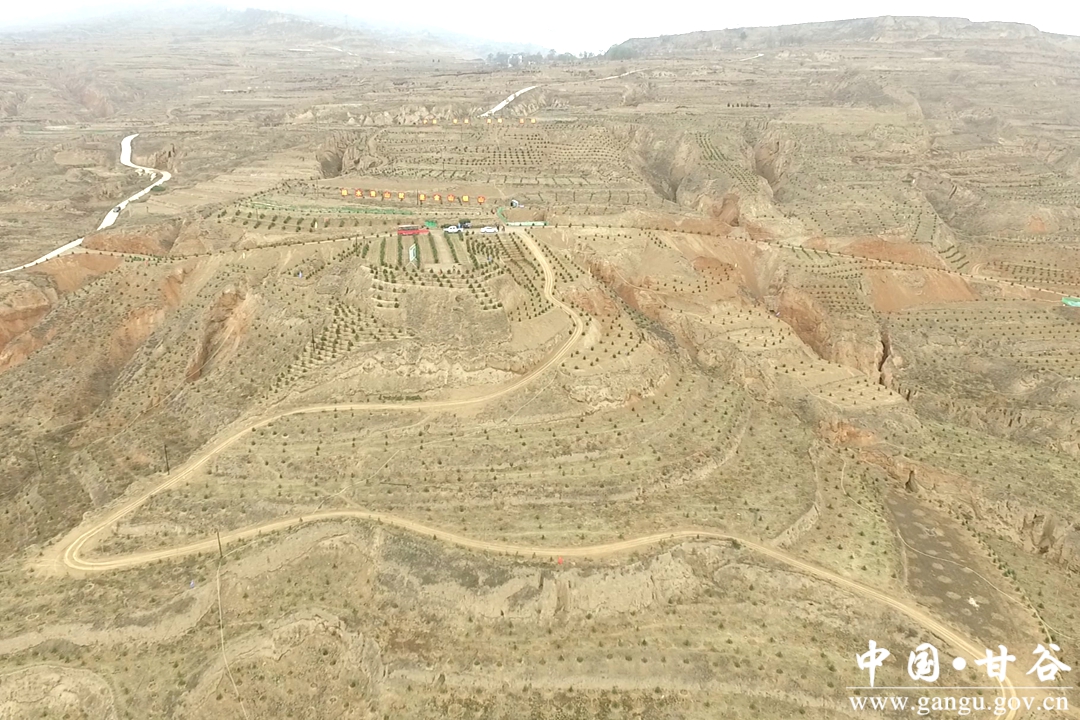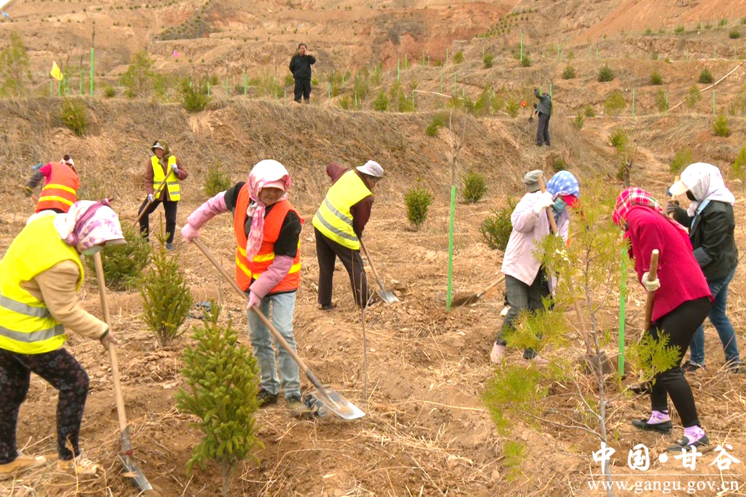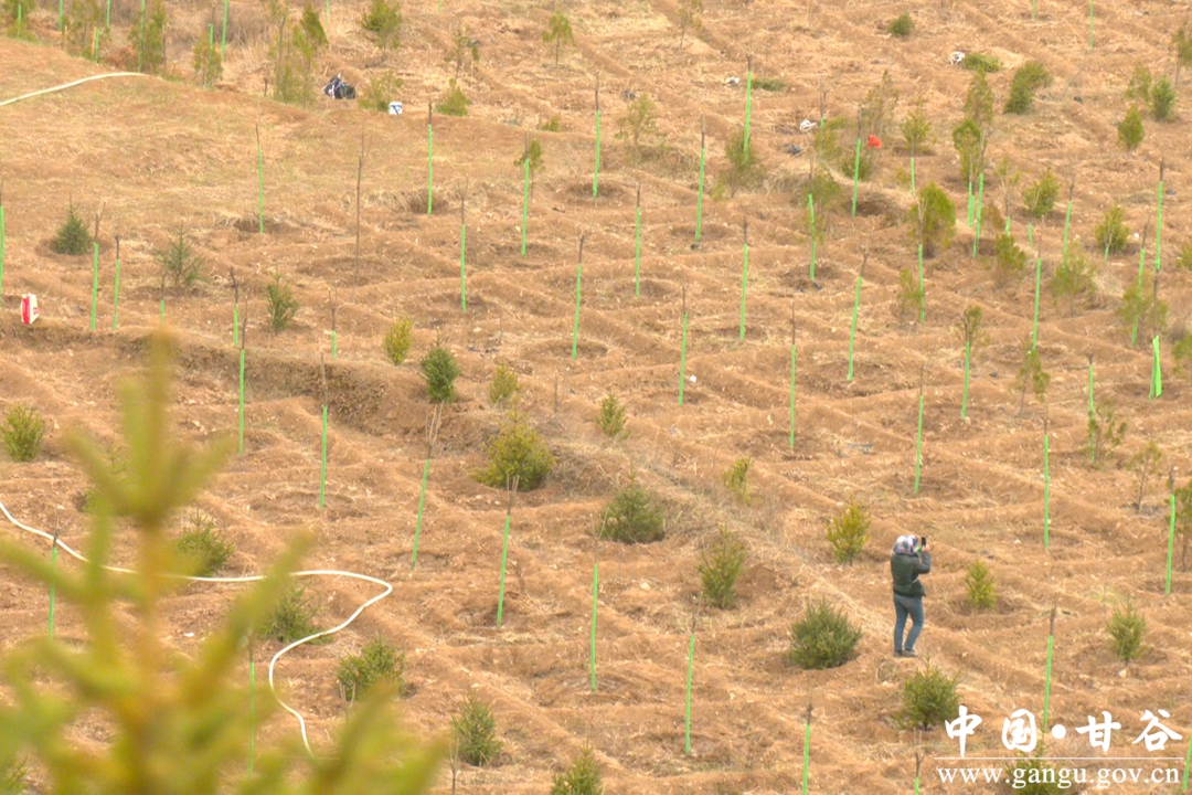 在甘谷县磐安镇东坪二期植树造林点,工人们正忙着栽植树苗。栽植好的各种树苗点染在山坡上,让原本单调的色彩一下子丰富起来。
