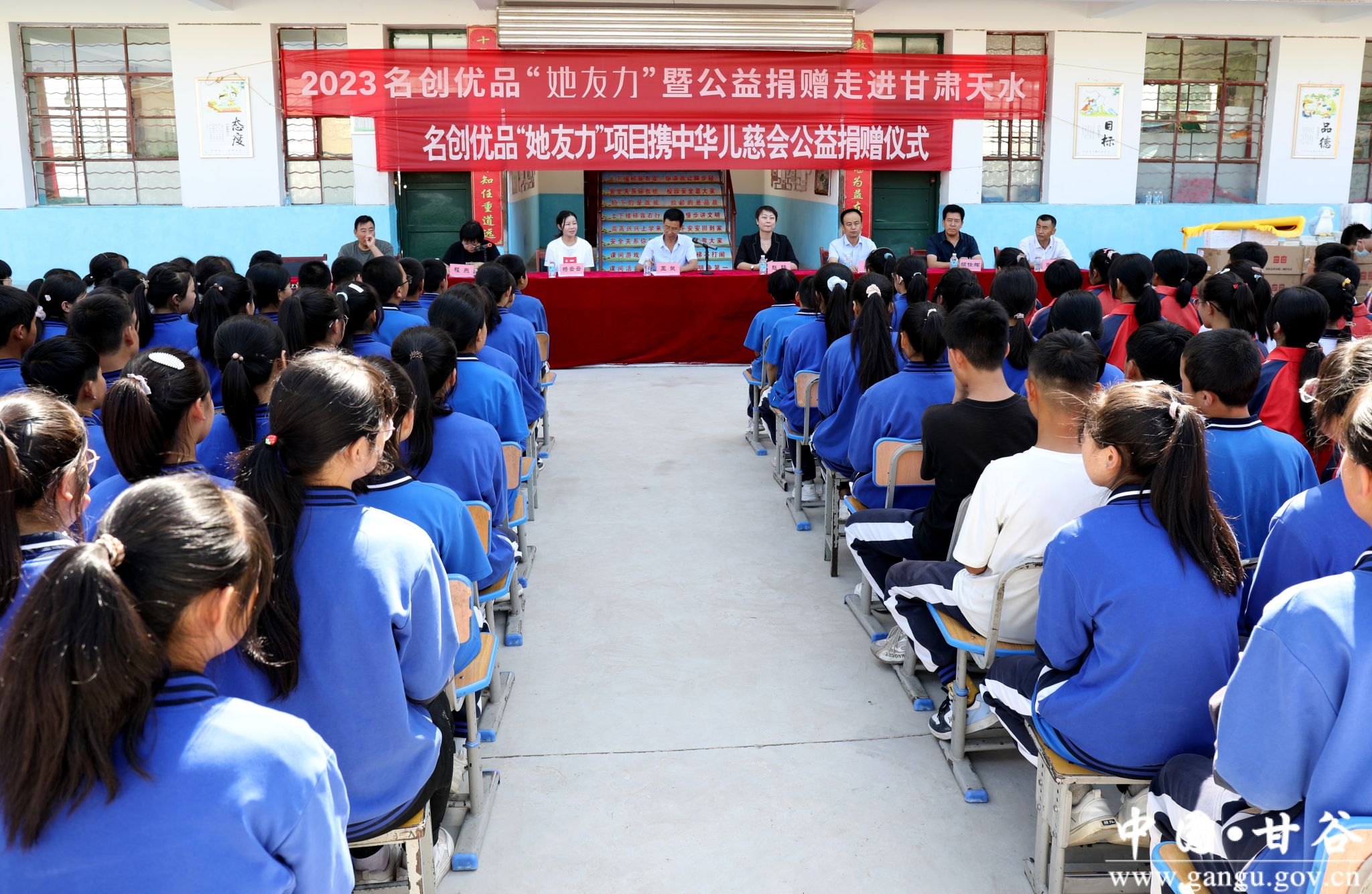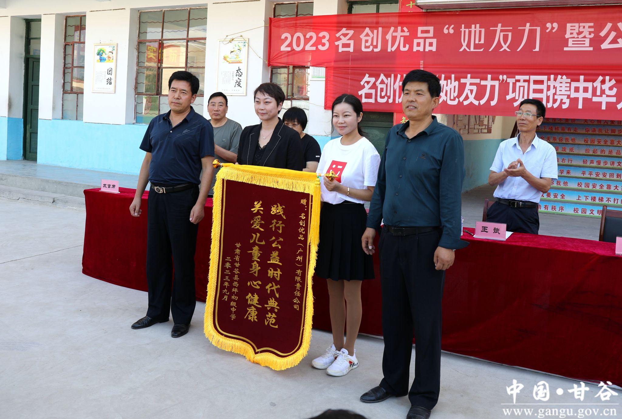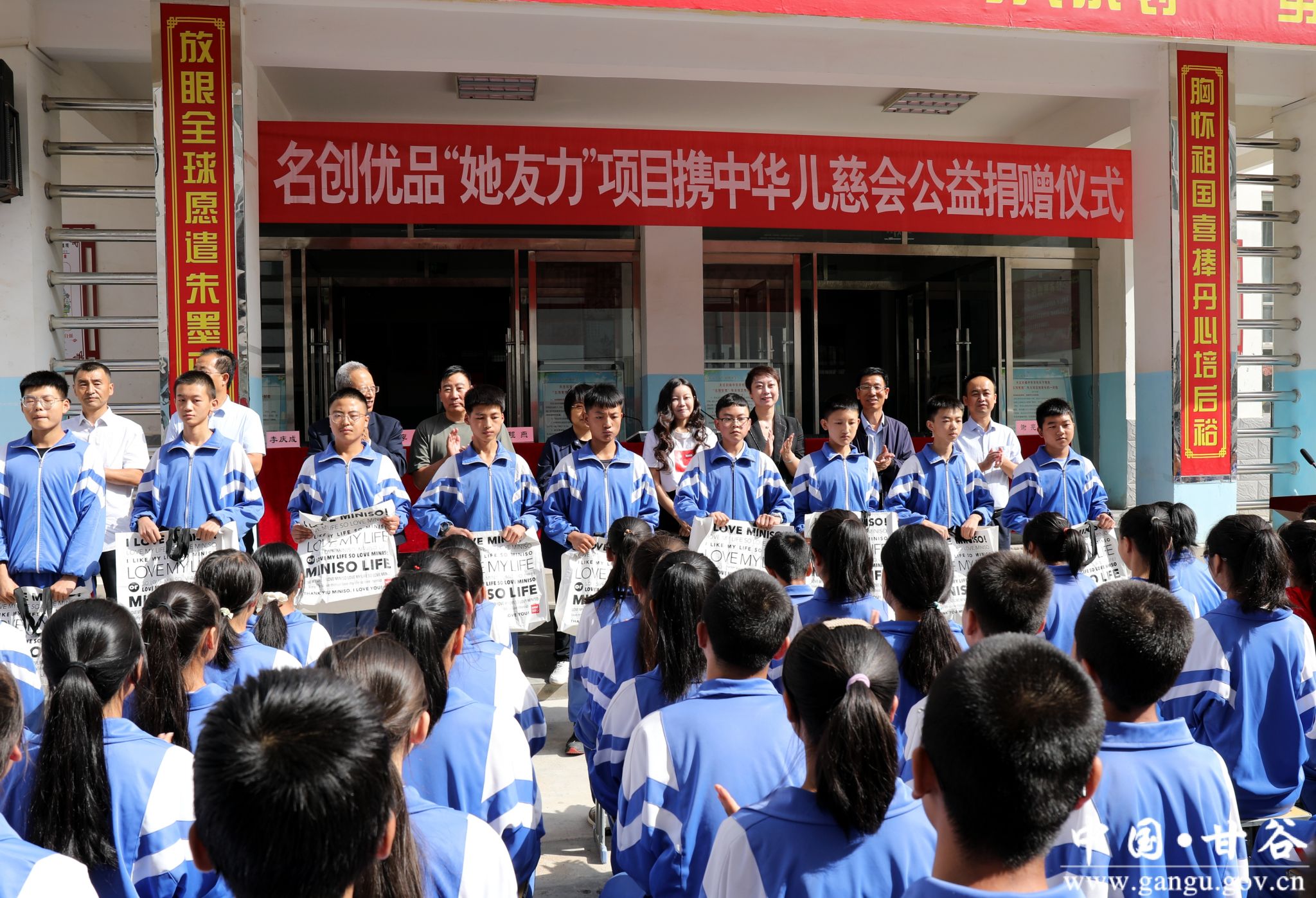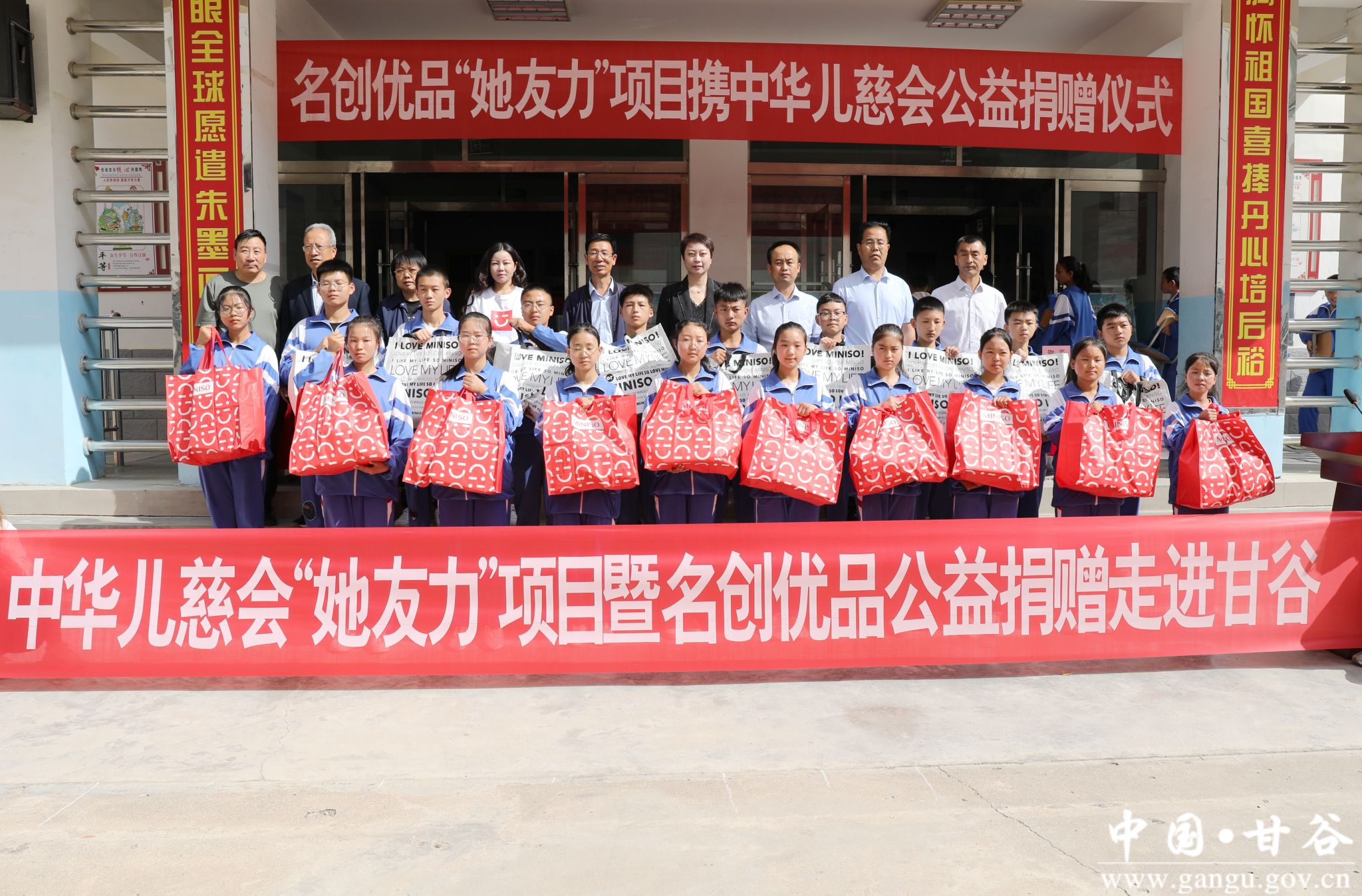9月4日至5日,中华儿慈会携手广州名创优品“她友力”公益项目走进甘肃甘谷,为甘谷县大庄镇初级中学、西坪镇初级中学、八里湾初级中学、白家湾九年制学校进行爱心捐赠。中华少年儿童慈善救助基金会主任赵玮女士,名创优品执行副总裁杨云云,甘谷县勤工俭学办负责人及关工委负责人出席捐赠仪式。