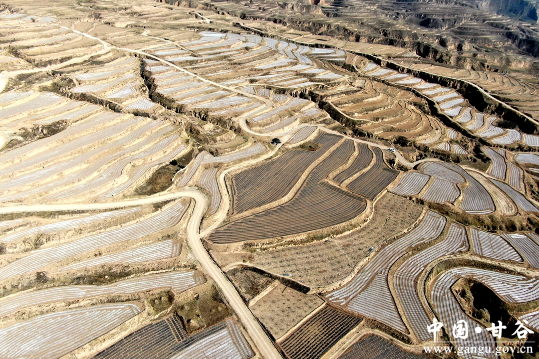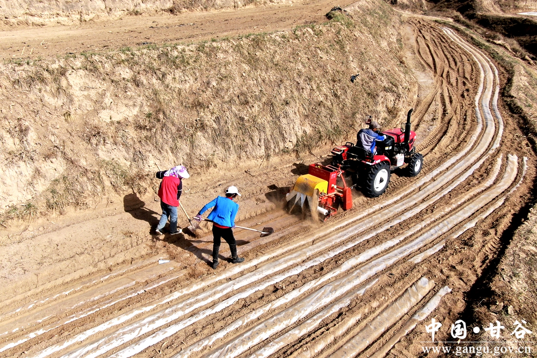 甘谷县乾农源农民专业合作社巧借撂荒地“东风”在南城北城流转土地3000亩,抢抓土壤墒情较好的有利时节,采用人机结合方式进行耙地、堆肥、铺膜,一垄垄地膜在阳光的照射下宛若一条条“银龙”,横卧在梯田显得格外耀眼。