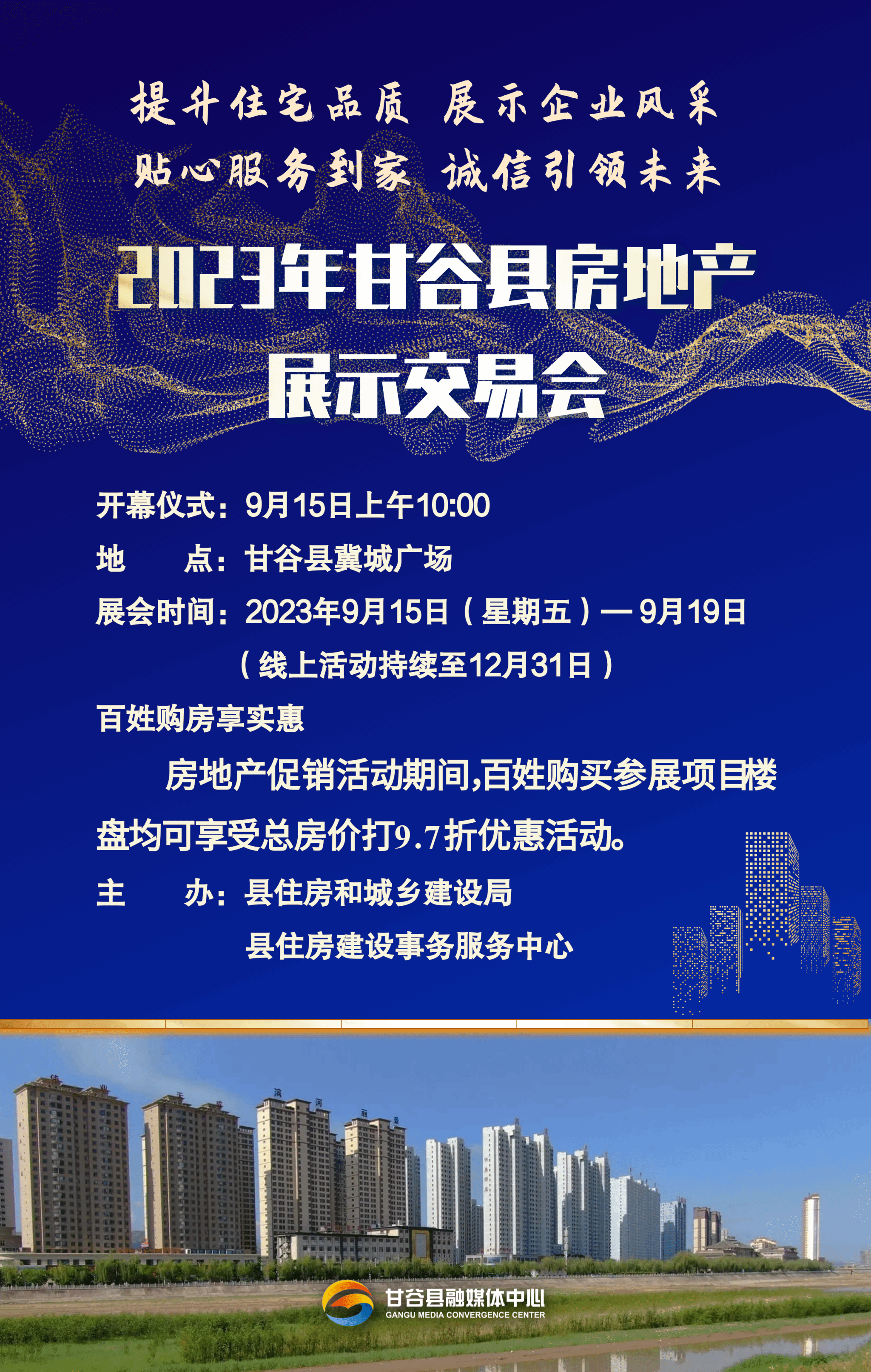 近日,记者从甘谷县住房和城乡建设局、甘谷县住房建设事务服务中心获悉,2023年甘谷县“迎中秋、庆国庆”房地产展示交易会将于9月15日至19日在冀城广场举行。