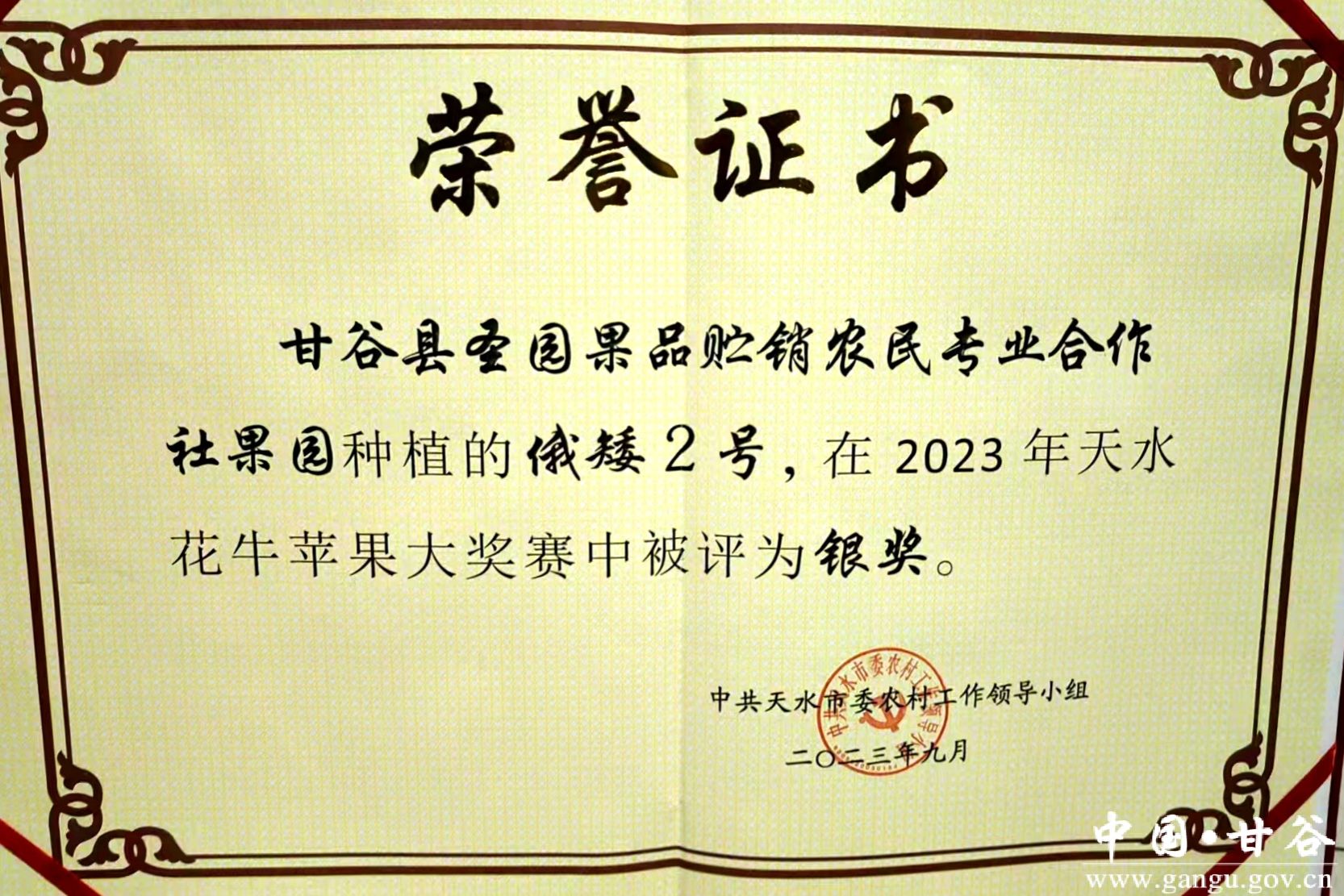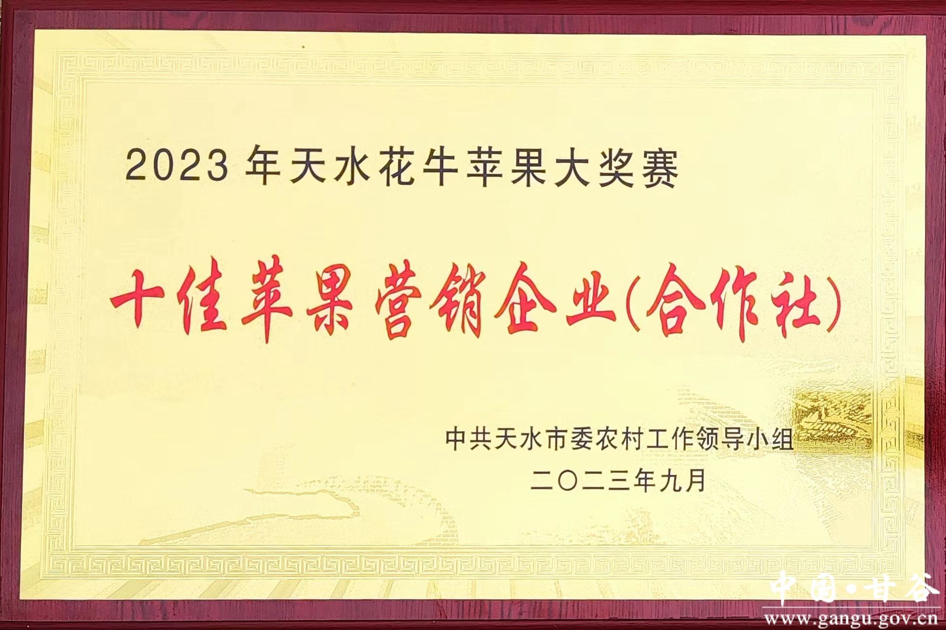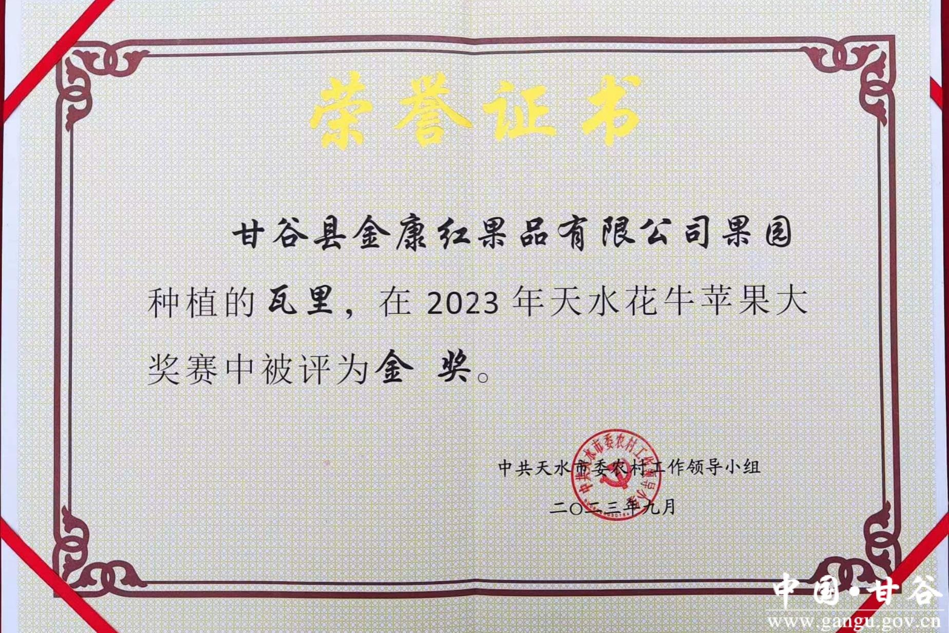 其中,甘谷县金康红果品有限公司果园选送的瓦里在2023年天水花牛苹果大奖赛中被评为金奖,甘谷县白家湾乡三十铺村王建军果园和甘谷县安远镇圣园果品贮销农民专业合作社果园选送的俄矮2号荣获银奖,甘谷县白家湾乡金叶果品专业合作社、甘谷县六峰镇蒋家窑村蒋胜娃和甘谷县谢家湾乡浩泽农民专业合作社荣获优秀奖,甘肃农小胖农业科技有限公司在2023年天水花牛苹果大奖赛中荣获十佳苹果营销企业。