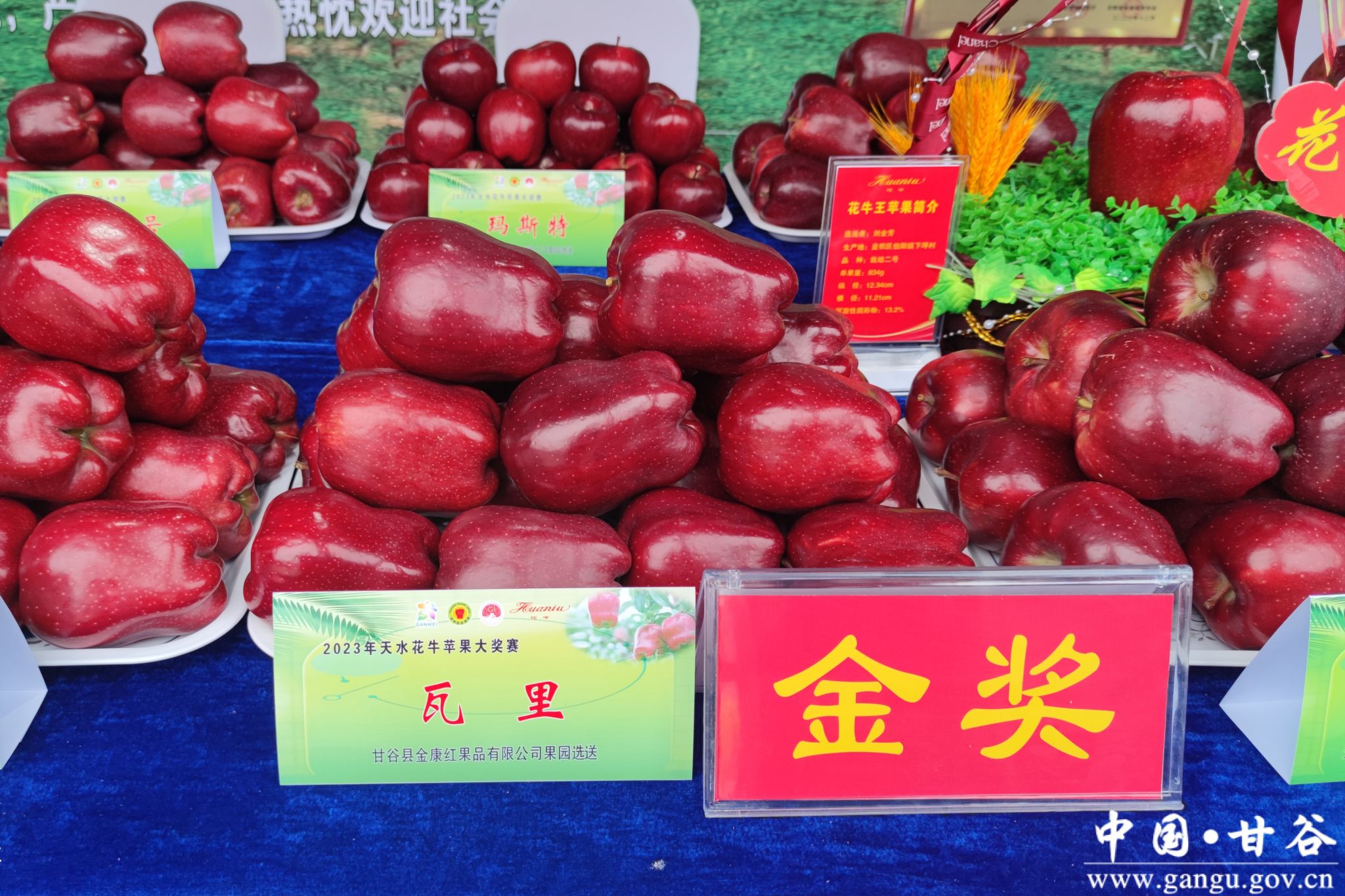 在本次花牛苹果大会开幕式上,甘谷县共荣获花牛苹果鉴评活动金奖1个,银奖2个,优秀奖3个,花牛苹果十佳营销企业1个,现场完成花牛苹果采购订单1600吨。