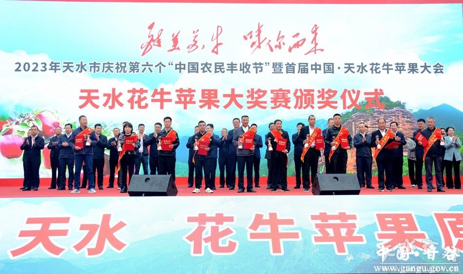 9月23日上午,2023年天水市庆祝第六个中国农民丰收节暨首届中国·天水花牛苹果大会开幕式在麦积区马跑泉市政广场举行。开幕式上举行了花牛苹果大奖赛颁奖仪式,分别为花牛苹果大奖赛“花牛王”、金奖、银奖、优秀奖获得者以及“十佳苹果营销企业”进行了颁奖,还举行了花牛苹果订货签约仪式。首届中国·天水花牛苹果大会共有45家本地果品营销企业(合作社)与53家外地果品经销商签订花牛苹果购销协议5.5万吨、销售额5.7亿元。