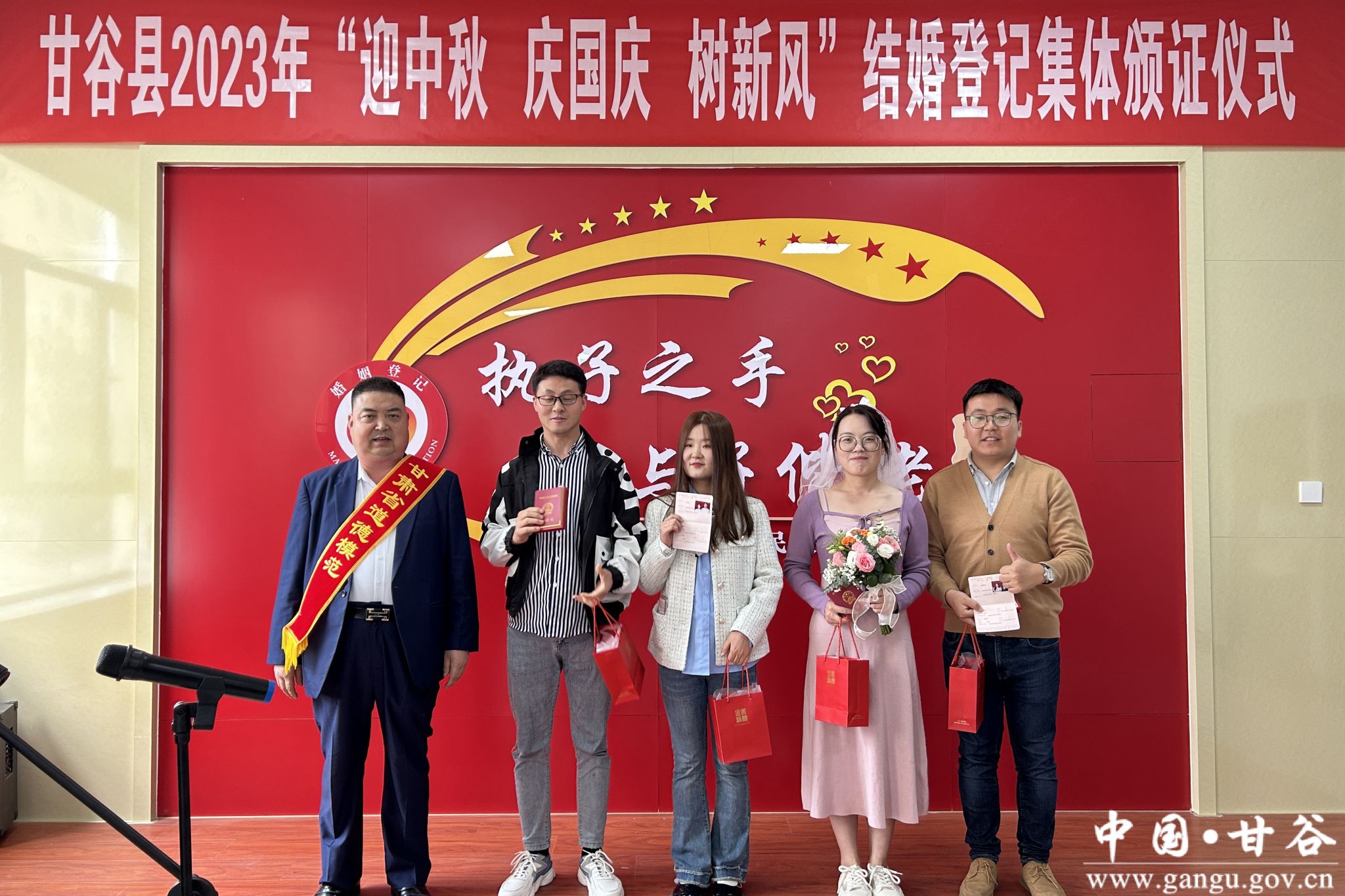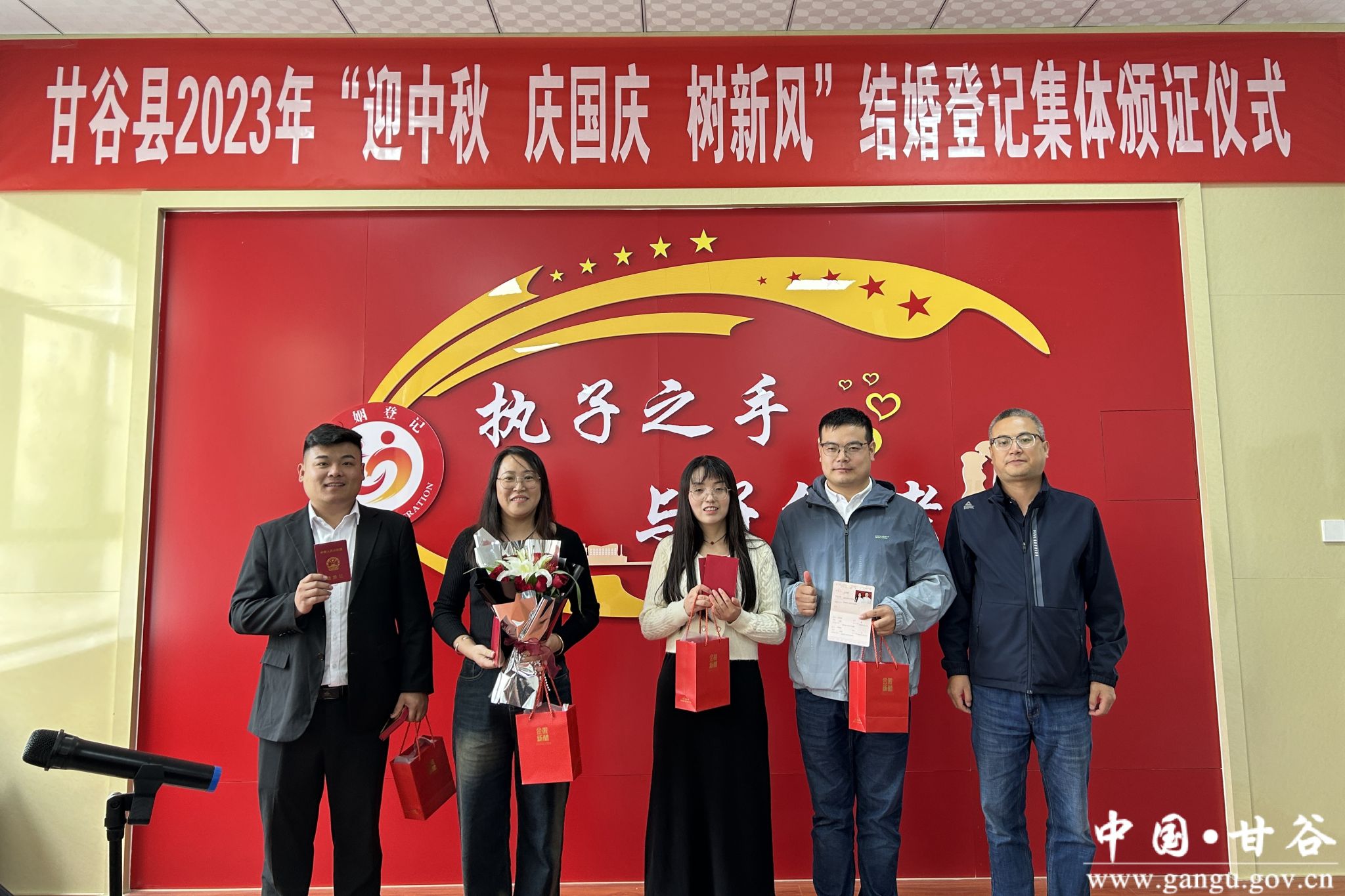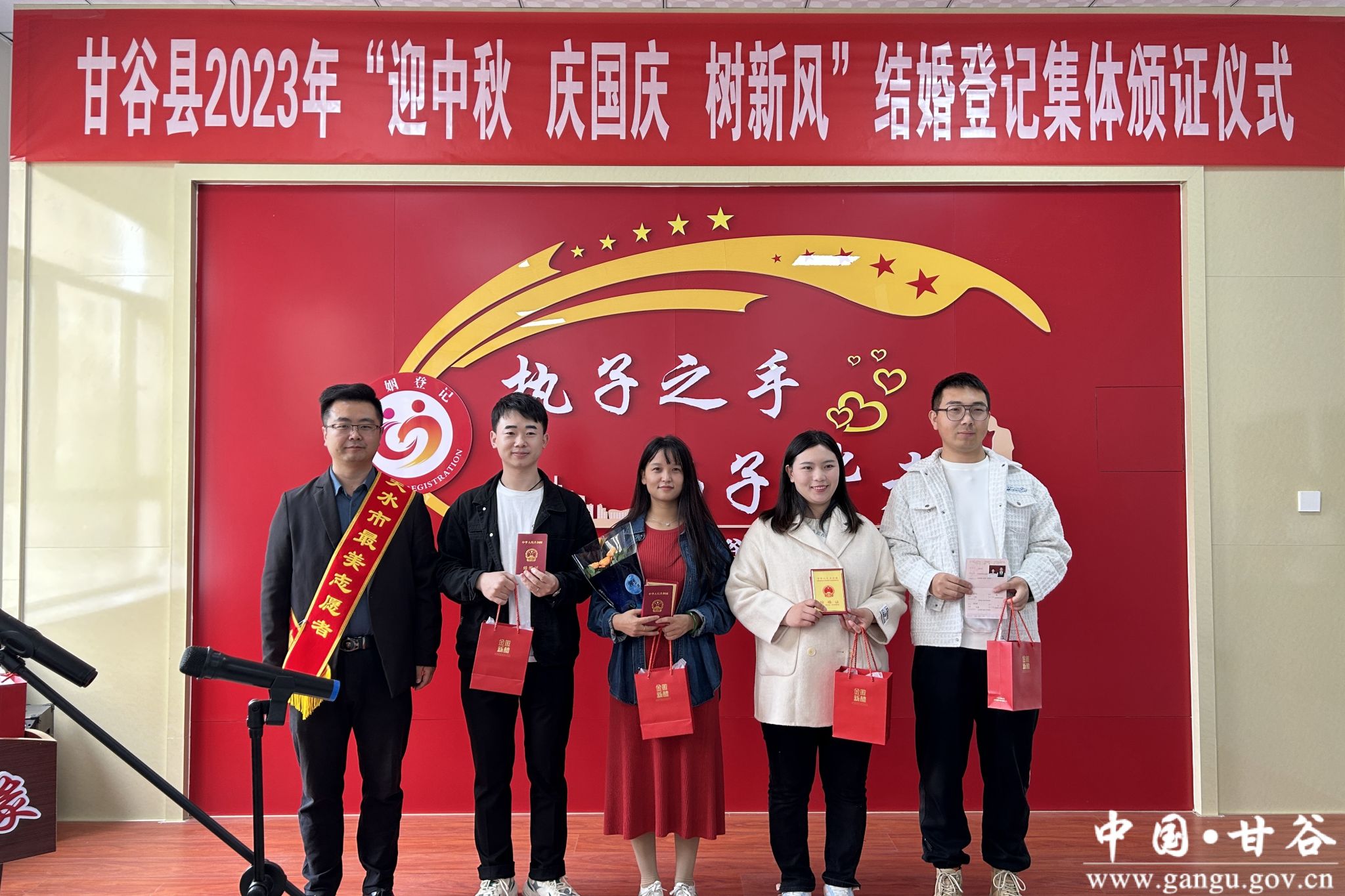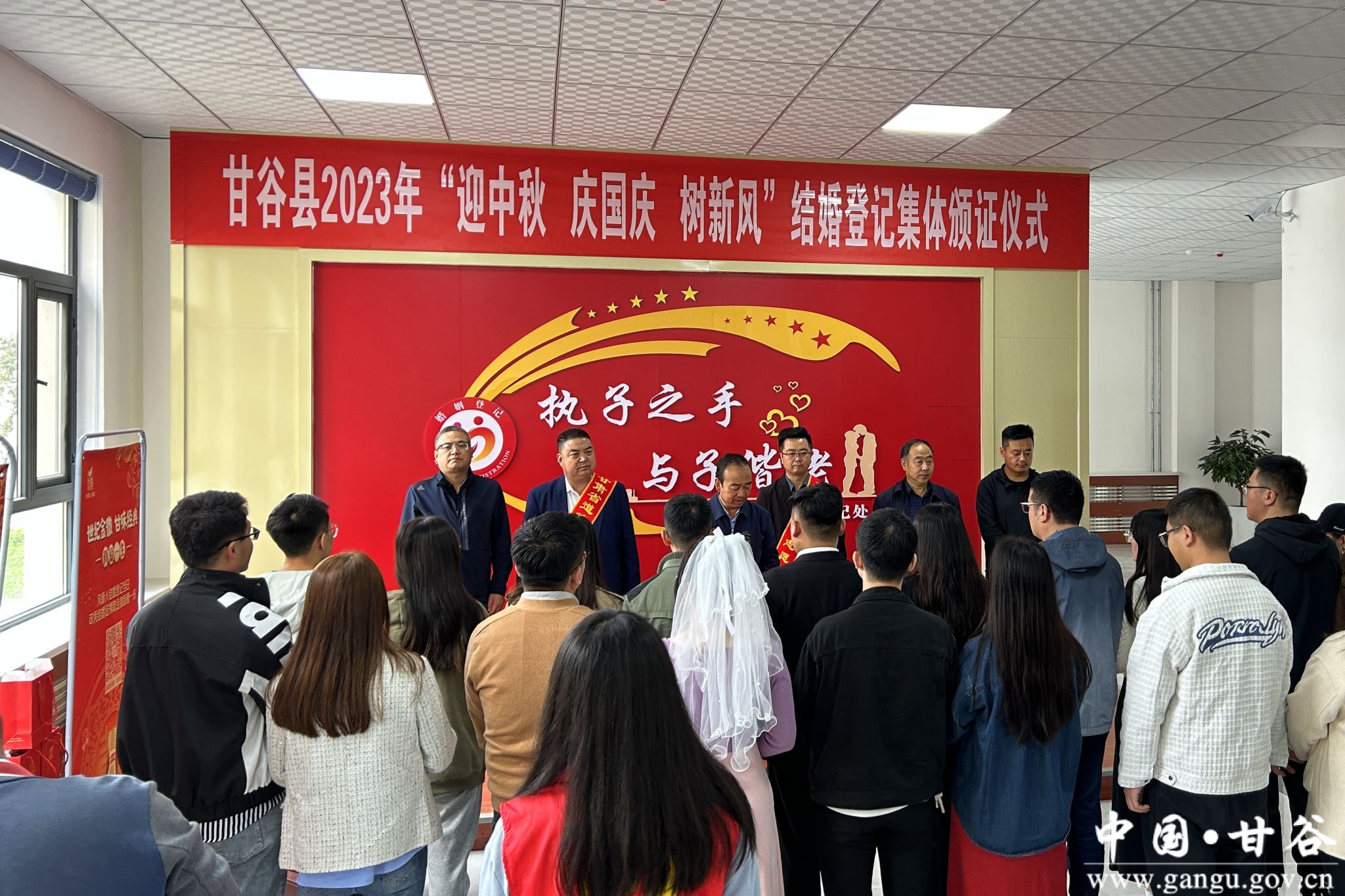 值中秋国庆双节来临之际,9月28日上午,在县民政局婚姻颁证大厅举办了甘谷县2023年“迎中秋 庆国庆 树新风”结婚登记集体颁证仪式。