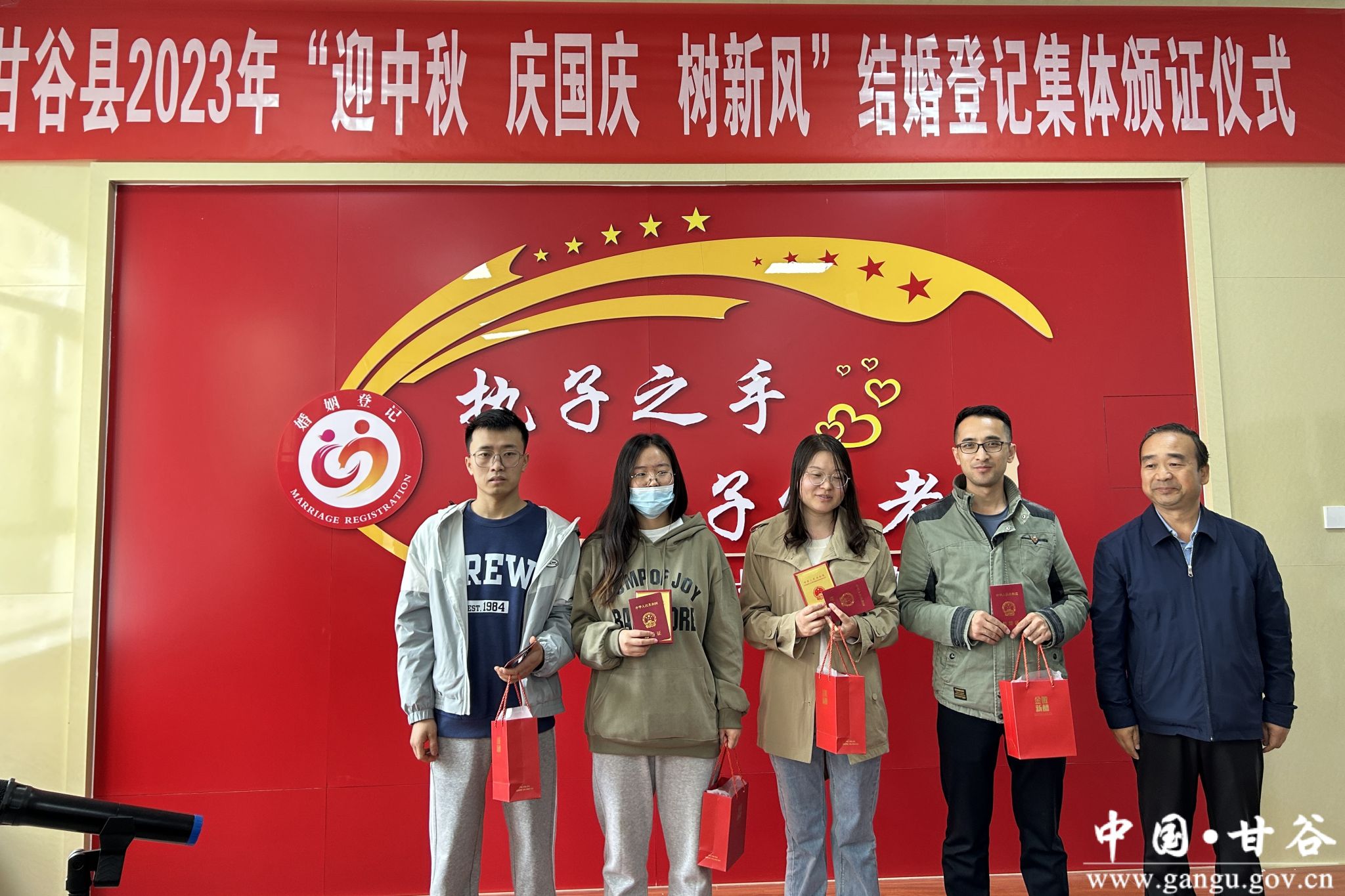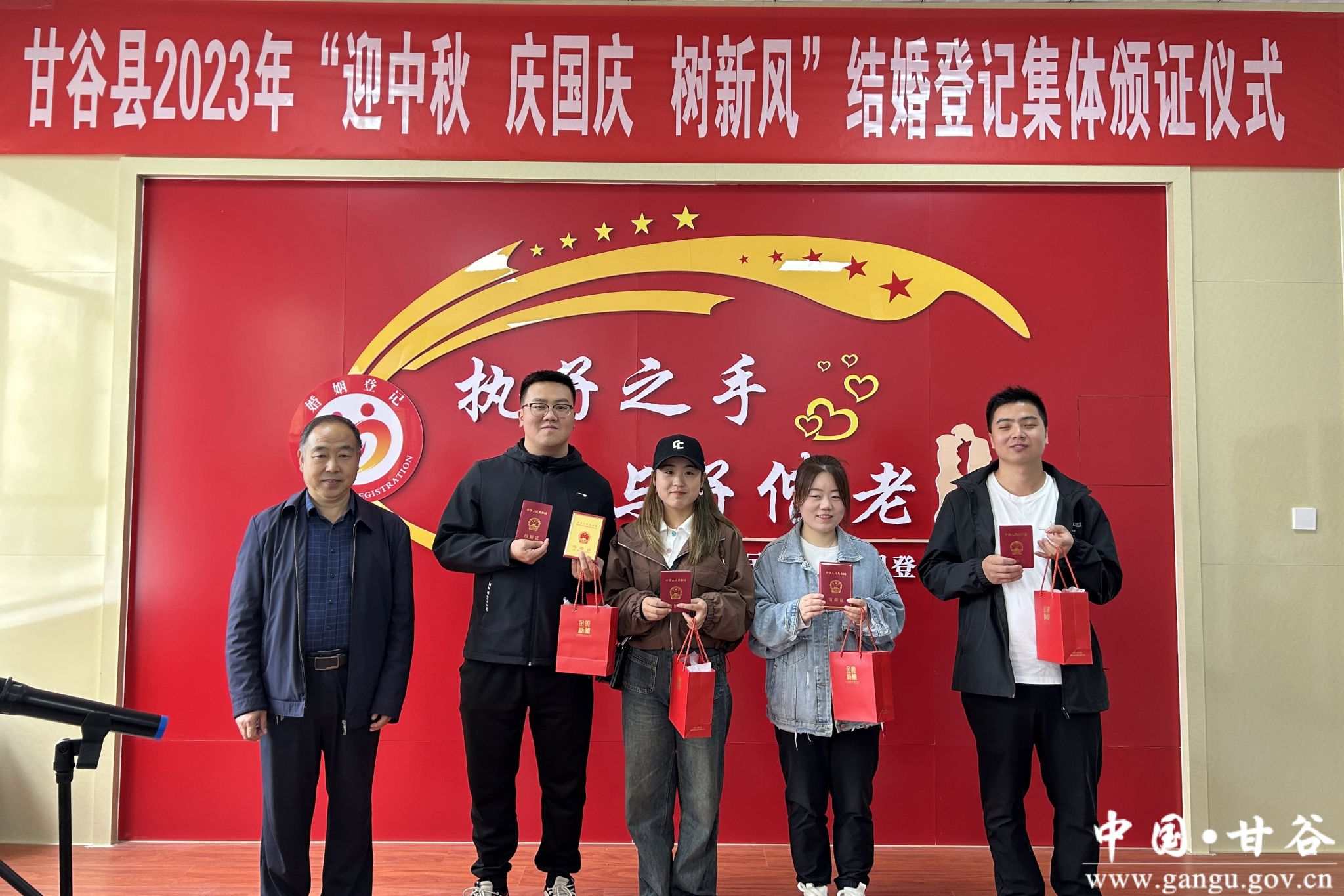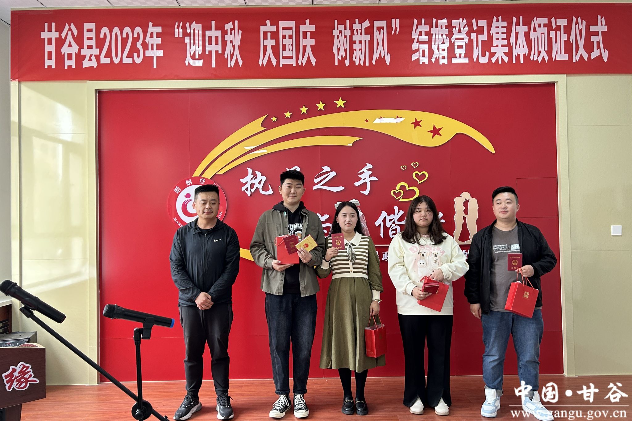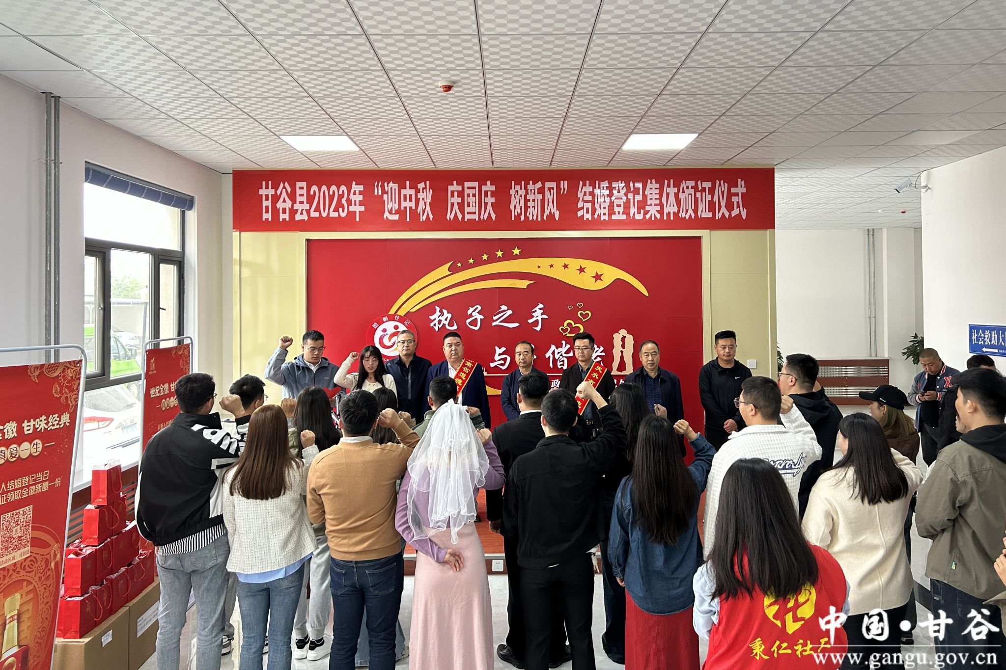 值中秋国庆双节来临之际,9月28日上午,在县民政局婚姻颁证大厅举办了甘谷县2023年“迎中秋 庆国庆 树新风”结婚登记集体颁证仪式。
