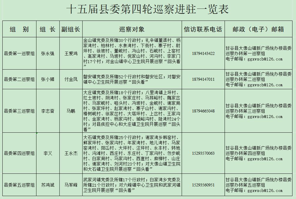 按照市委关于对医疗卫生领域开展巡察“回头看”的工作部署和县委统一要求,截至10月10日,十五届甘谷县委第四轮巡察的5个巡察组完成了对常规巡察的磐安镇、金山镇、大庄镇、大石镇、武家河镇、白家湾乡6个乡镇及所辖164个村(社区),礼辛镇17个村、八里湾镇24个村、谢家湾乡23个村和巡察“回头看”的县疾控中心、磐安镇中心卫生院、大像山镇卫生院、六峰镇中心卫生院、金山镇中心卫生院、大庄镇卫生院、大石镇卫生院、武家河镇卫生院8个医疗卫生单位的进驻工作,十五届县委第四轮巡察工作全面展开。