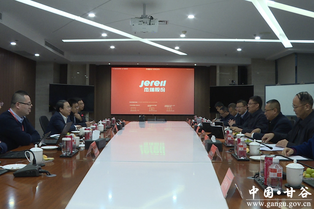 考察结束后,在杰瑞集团股份有限公司召开了座谈会。会上,董事长王坤晓对孙忠平一行表示热烈欢迎,并向考察团介绍了公司的基本情况、发展历程及产业板块,观看了杰瑞集团宣传片。王坤晓表示,甘谷县发展优势明显、发展潜力巨大,企业高度重视与甘谷的合作,并将聚焦甘谷重点产业,进一步加大投资力度,扩大合作领域,全力推进杰瑞锂电池负极材料签约项目的落地实施,3月份全面启动建设,9月份建成两个数字化生产车间,力争年底达标投入试运营,为推动甘谷经济社会高质量发展作出应有的贡献。