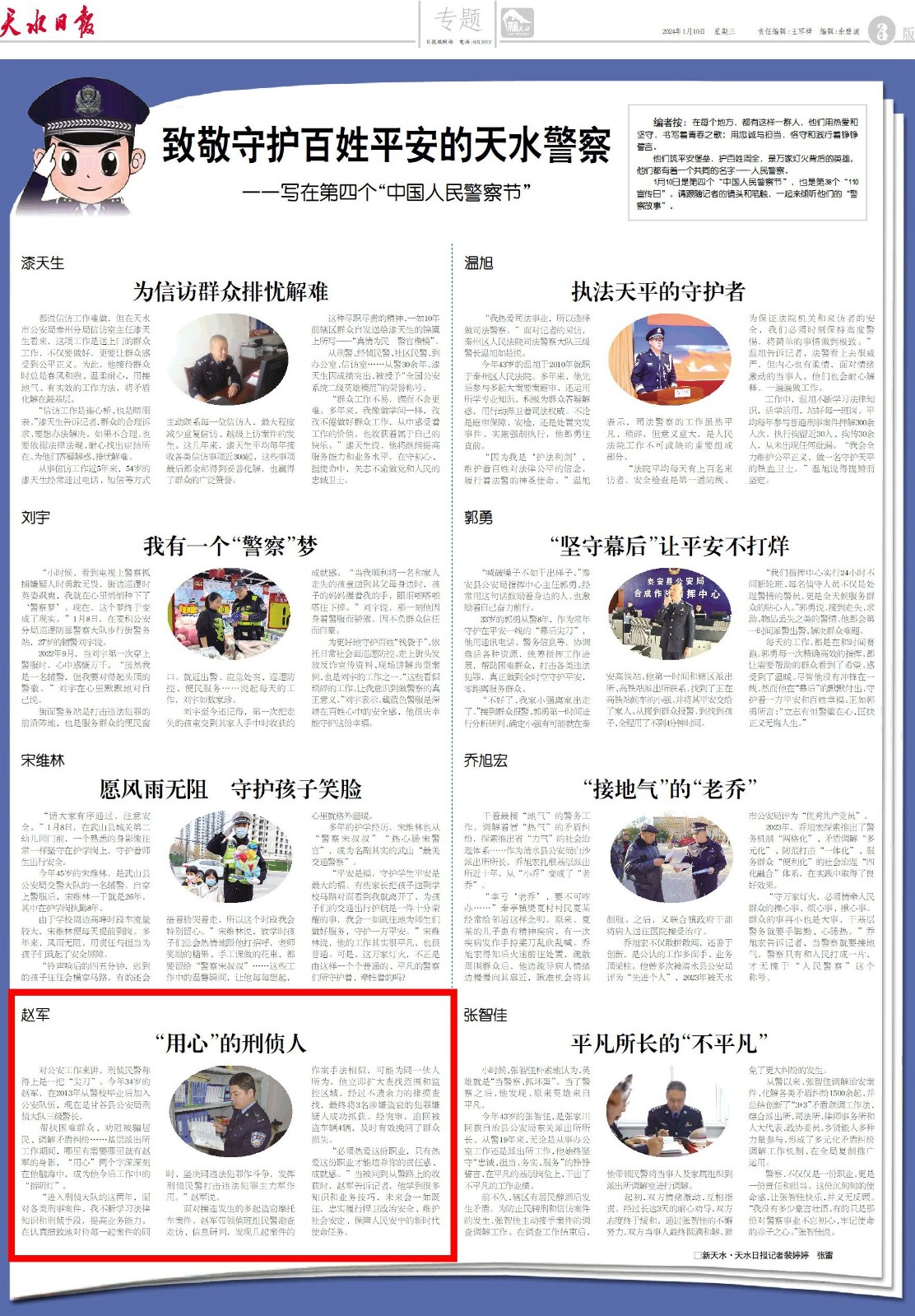 对公安工作来讲,刑侦民警称得上是一把“尖刀”。今年34岁的赵军,在2013年从警校毕业后加入公安队伍,现在是甘谷县公安局刑侦大队三级警长。