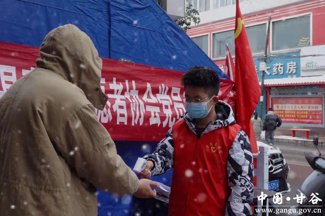 2月5日,正值虎年新春,在这个无数返乡游子与家人团聚的日子里,迎来疫情防控压力倍增的关键时期,为了让人民群众过个平安春节,共青团甘谷县委组织大学生志愿者走上街头,用实际行动助力防疫工作,用志愿服务为群众出行安全提供保障,在银装素裹的城市里,筑起了一道温暖的“红色”风景线。