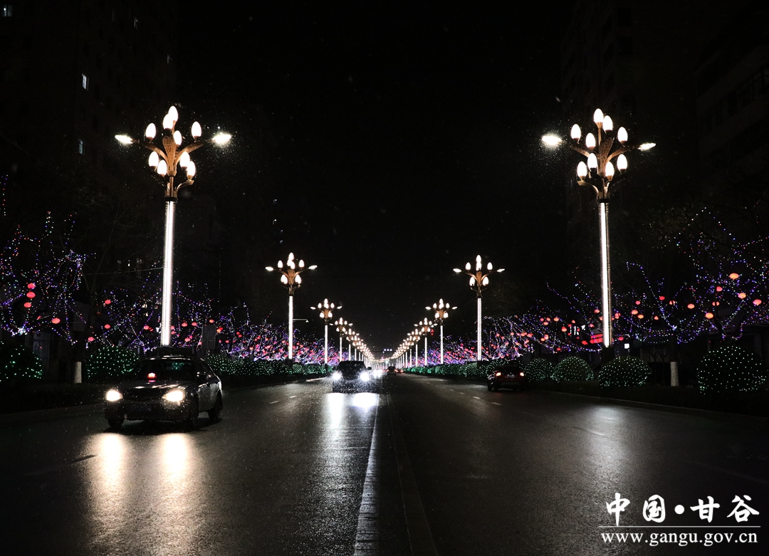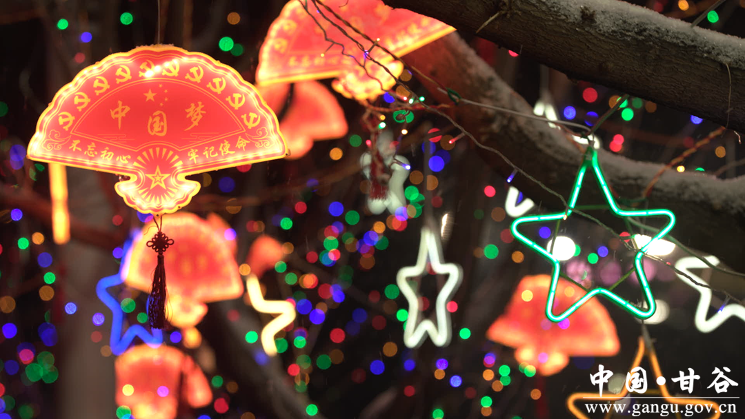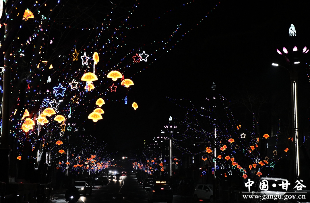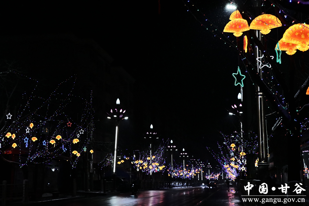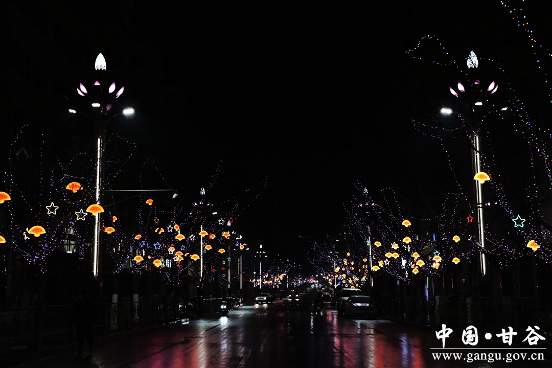 春节的脚步越来越近,甘谷城区华灯闪烁,流光溢彩,一条条灯火璀璨的街道,一座座流光溢彩的建筑,及提升了城市品质、也提高了城市整体形象,大街小巷处处洋溢着欢乐喜庆的节日氛围,年味也越来越浓。