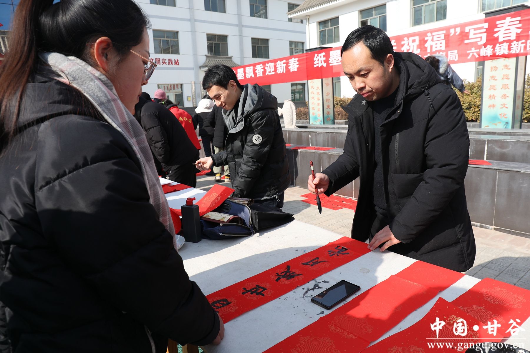 活动现场,专业的戏曲演员们相继表演了《大升官》《三娘教子》《火焰驹》《龙凤呈祥》等经典曲目,村民们犹如身临其境,陶醉于悠扬婉转的唱腔之中,赢得了现场观众的阵阵掌声。在隔壁的村委大院里,来自县文联的十多位书法家,现场义务为村民书写春联、福字,供村民选择领取。写春联是一种文化艺术,也是一种文化传承和情感表达,寄托着人们对美好生活的向往和追求。络绎不绝的村民不断前来领取“福”字和春联,书法家们挥毫泼墨、奋笔疾书、倾情奉献,活动现场一片喜庆,楹联匝地,红瑞爆满,一副副春联饱含着人们对新年的美好期盼,让广大村民感受到了传统文化的魅力。