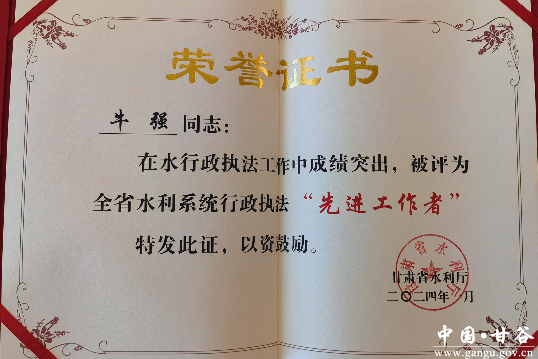 新甘谷讯【通讯员 刘豆豆】1月26日,省水利厅联合省法院、省检察院、省公安厅、省司法厅召开全省水行政执法“三大专项行动”总结视频会暨执法先进集体和先进工作者表扬大会。会上,甘谷县水务局荣获全省水利系统行政执法先进集体,甘谷县水务局牛强同志荣获全省水利系统行政执法先进工作者并代表全省先进工作者作交流发言。