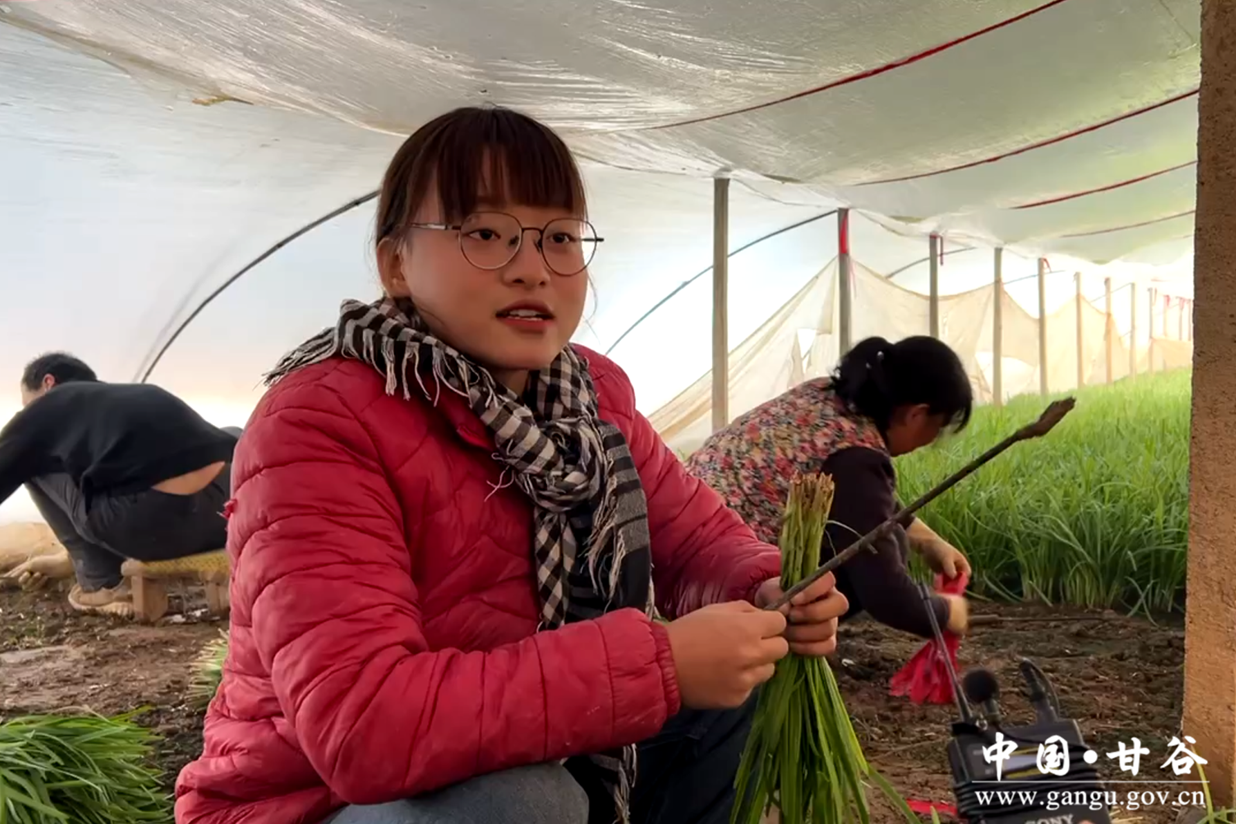 甘谷县磐安镇燕家村燕建华是一名大学生,她说:学校刚放假,就赶回来帮爸妈割韭菜。家里有五六大棚,一亩地能产2000斤左右韭菜,今年收购价格一斤韭菜能卖一块八到两块,一个大棚能够收入3000多块钱。