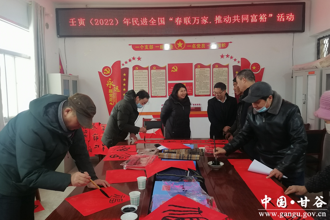 近日,“物物暖人心,字字显温情”——民进天水市委员会2022(壬寅)年“春联万家·推动共同富裕”文化下乡活动在金山镇米谷川村举行。市政协副主席、民进天水市委员会主委范多智一行参加活动并为脱贫户书写新春对联、捐赠爱心物资、送上新春祝福。县政协副主席马清平参加活动。