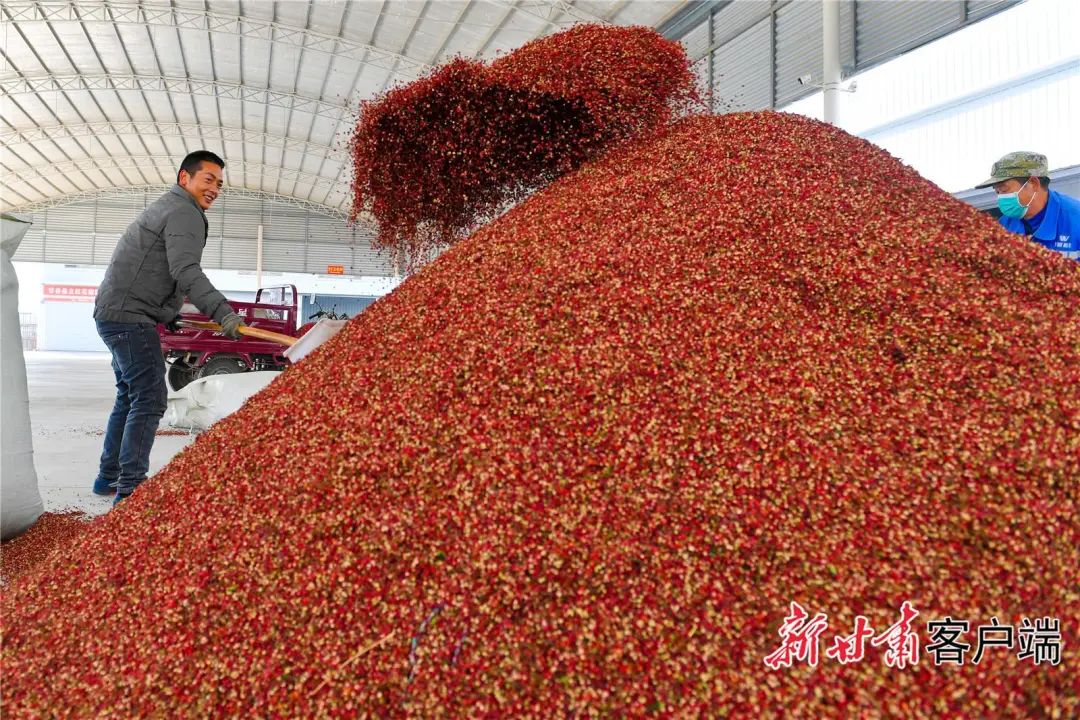 甘谷县六峰镇花椒集散交易服务中心工人正在分拣花椒。