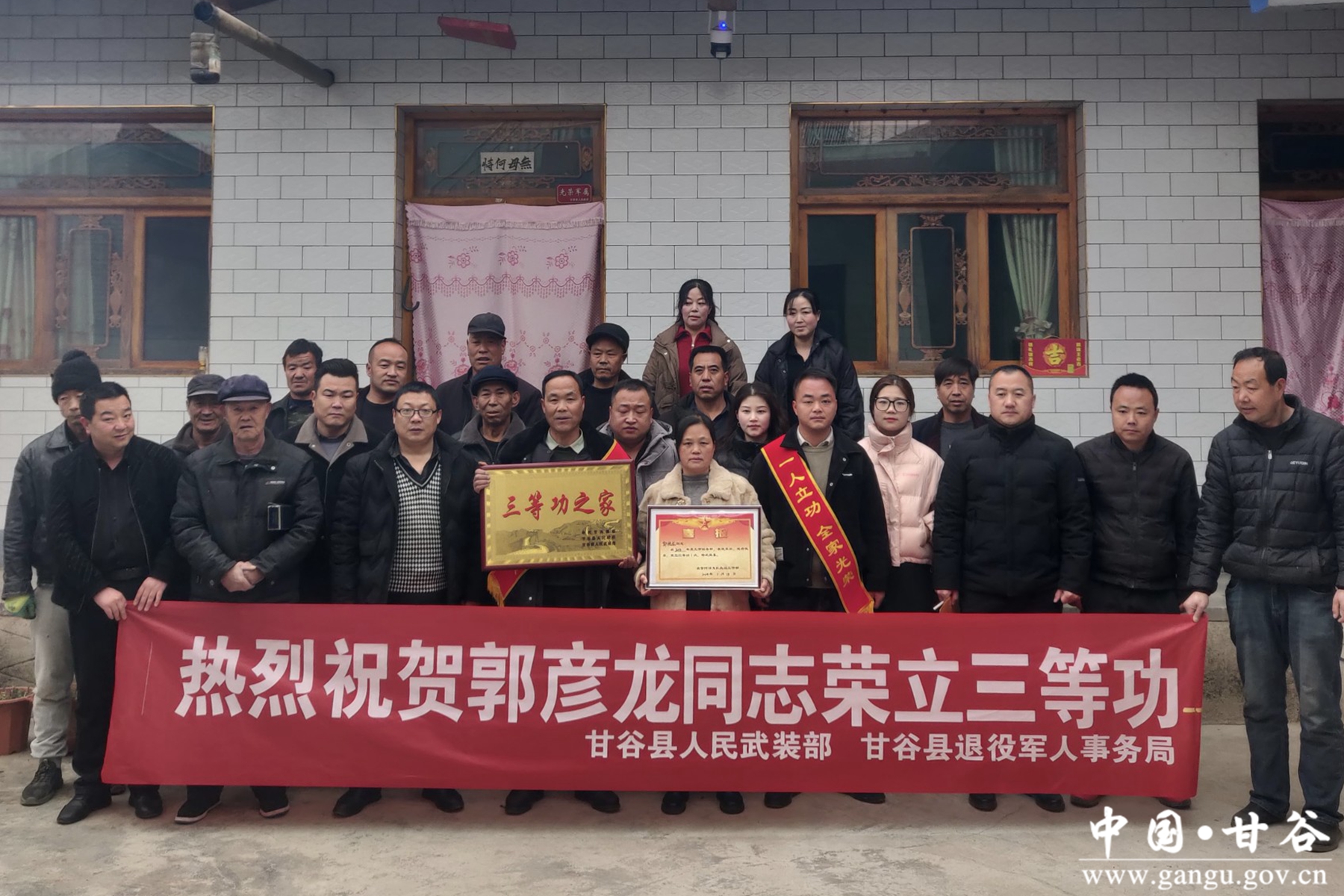 新甘谷讯【通讯员 马睿芳】为进一步提升社会各界对军人的尊崇,增强军人军属的荣誉感与获得感,激发广大官兵献身国防、矢志强军的强大精神动力,弘扬拥军优属、拥政爱民的光荣传统。2月19日,甘谷县退役军人事务局为荣立三等功的郭彦龙、杨小强等八名军人家庭送去立功喜报及慰问品,送上党和政府的衷心祝贺和亲切关怀。