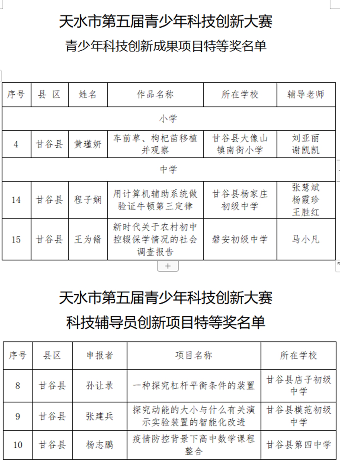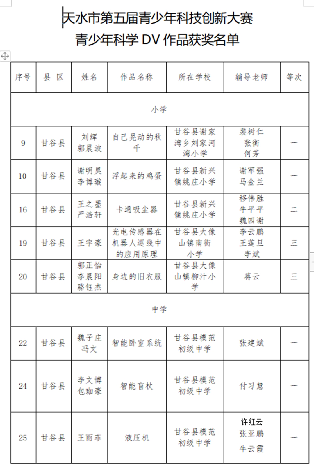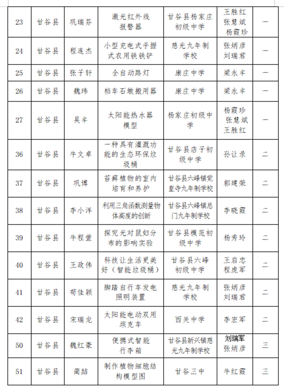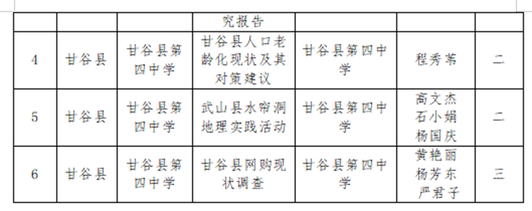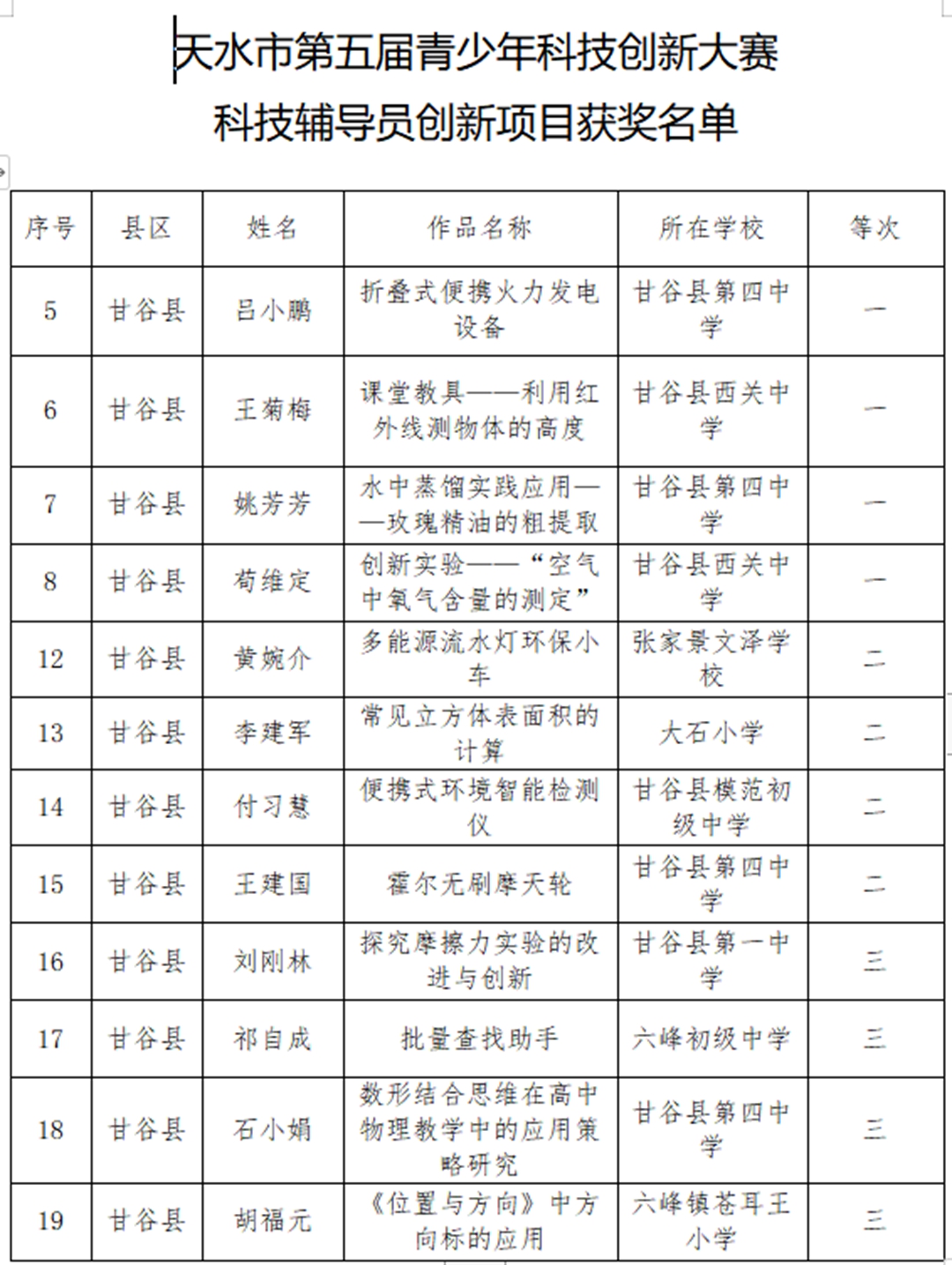 近日,天水市第五届青少年科技创新大赛获奖名单揭晓,甘谷县第四中学师生再创佳绩:杨志鹏老师的《疫情防控背景下高中数学课程整合》获科技辅导员创新项目特等奖;裴昊同学的《甘谷县渭河流域川区韭菜种植病虫害调查研究报告》获青少年科技实践活动一等奖(杨志鹏辅导);吕小鹏老师的《折叠式便携火力发电设备》获科技辅导员创新项目一等奖;姚芳芳老师的《水中蒸馏实践应用——玫瑰精油的粗提取》获科技辅导员创新项目一等奖;程秀苇老师的《甘谷县人口老龄化现状及其对策建议》获青少年科技实践活动二等奖;高文杰、石小娟、杨国庆老师的《武山县水帘洞地理实践活动》获青少年科技实践活动二等奖;王建国老师的《霍尔无刷摩天轮》获科技辅导员创新项目二等奖;黄艳丽、杨芳东、严君子老师的《甘谷县网购现状调查》获青少年科技实践活动三等奖;石小娟老师的《数形结合思维在高中物理教学中的应用策略研究》获科技辅导员创新项目三等奖。