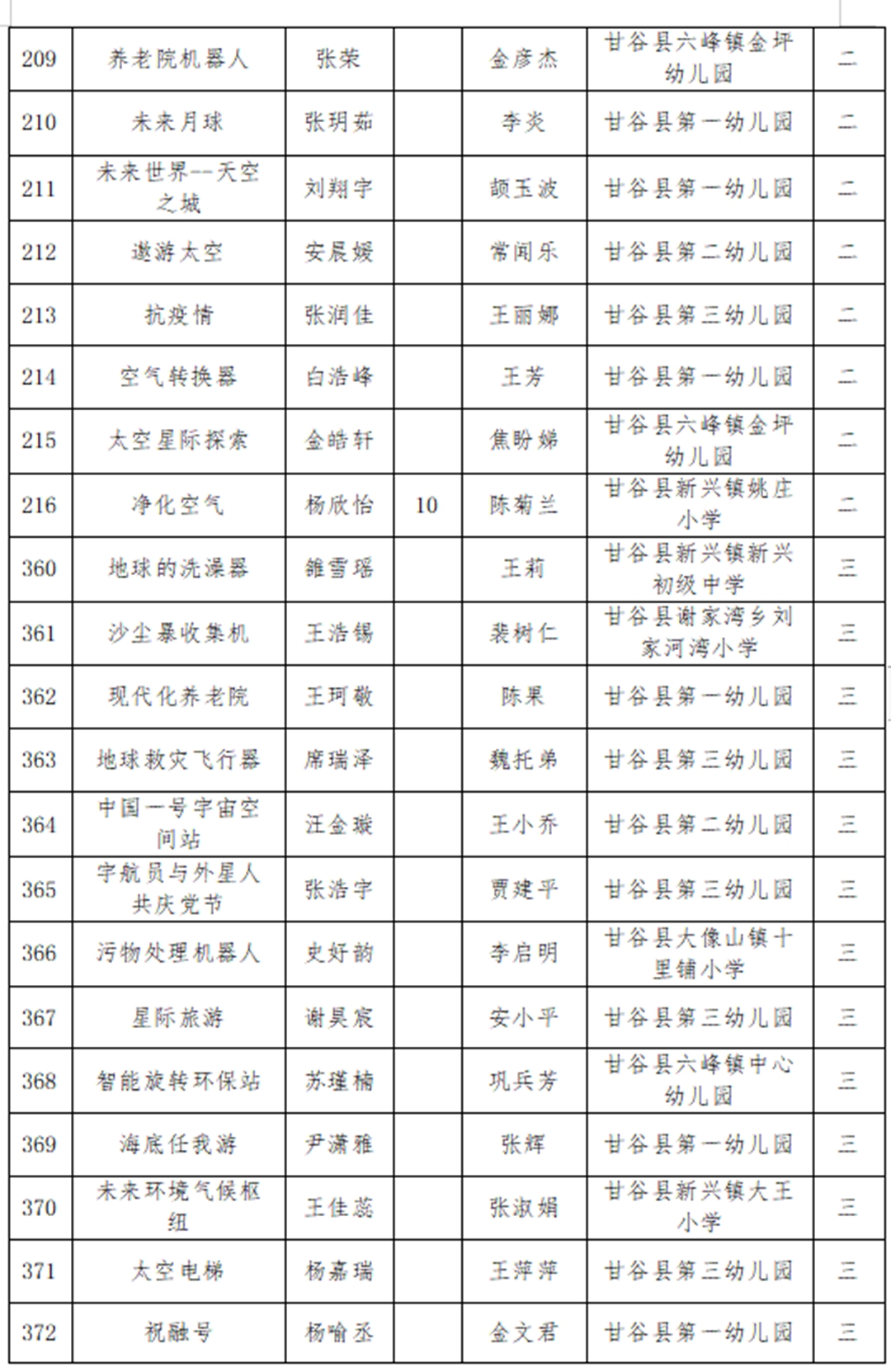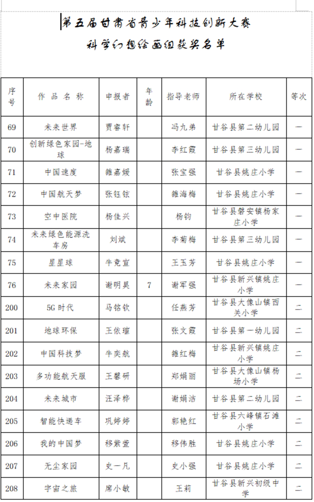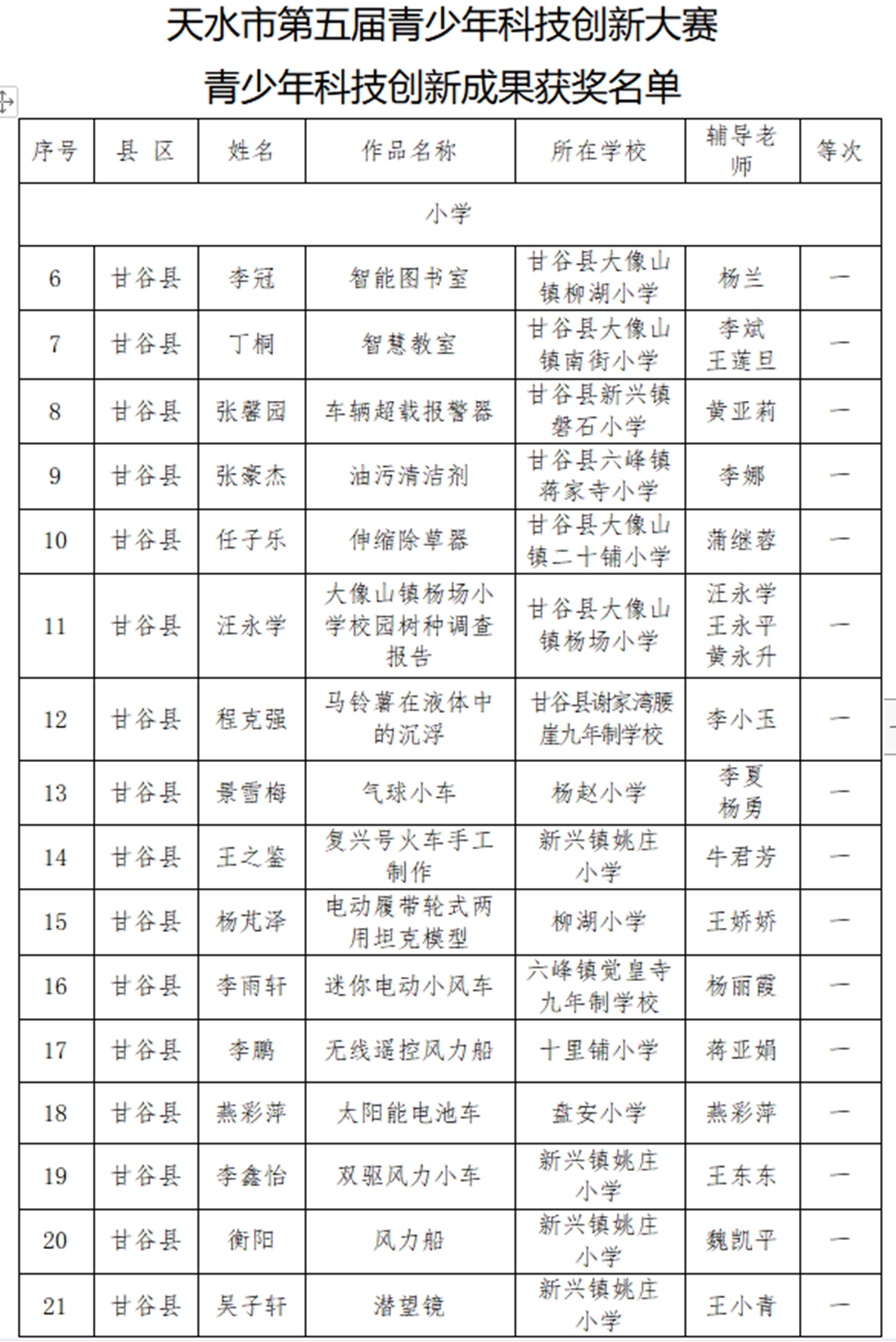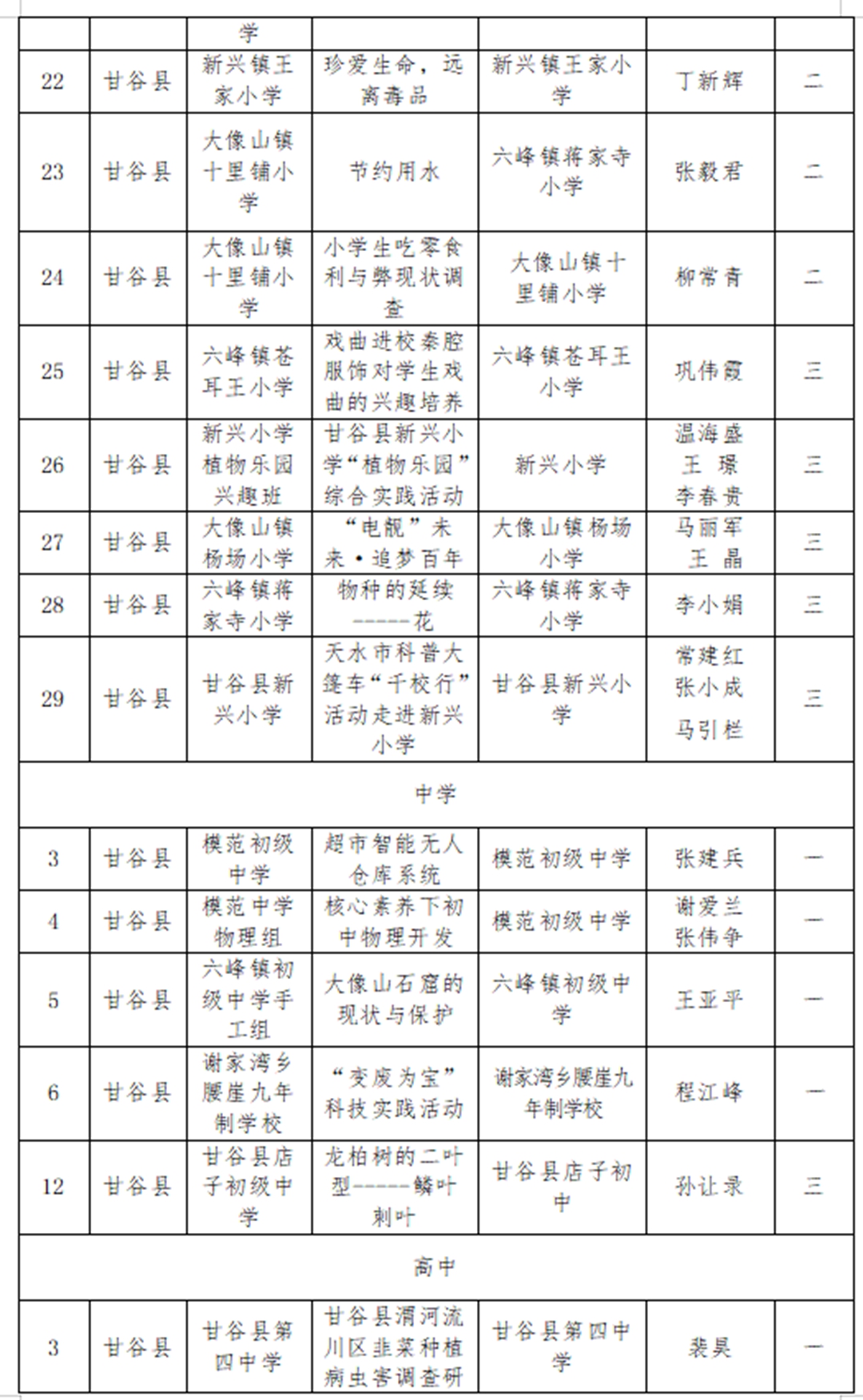 近日,天水市第五届青少年科技创新大赛获奖名单揭晓,甘谷县第四中学师生再创佳绩:杨志鹏老师的《疫情防控背景下高中数学课程整合》获科技辅导员创新项目特等奖;裴昊同学的《甘谷县渭河流域川区韭菜种植病虫害调查研究报告》获青少年科技实践活动一等奖(杨志鹏辅导);吕小鹏老师的《折叠式便携火力发电设备》获科技辅导员创新项目一等奖;姚芳芳老师的《水中蒸馏实践应用——玫瑰精油的粗提取》获科技辅导员创新项目一等奖;程秀苇老师的《甘谷县人口老龄化现状及其对策建议》获青少年科技实践活动二等奖;高文杰、石小娟、杨国庆老师的《武山县水帘洞地理实践活动》获青少年科技实践活动二等奖;王建国老师的《霍尔无刷摩天轮》获科技辅导员创新项目二等奖;黄艳丽、杨芳东、严君子老师的《甘谷县网购现状调查》获青少年科技实践活动三等奖;石小娟老师的《数形结合思维在高中物理教学中的应用策略研究》获科技辅导员创新项目三等奖。