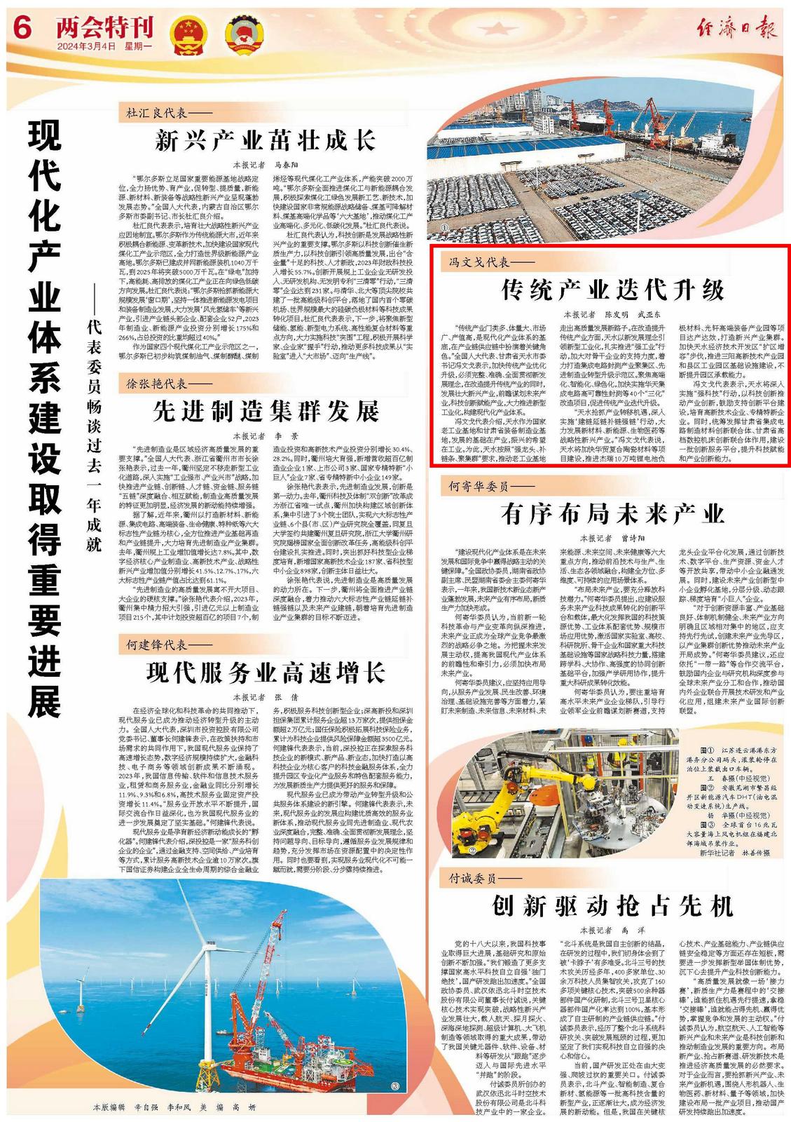 “传统产业门类多、体量大、市场广、产值高,是现代化产业体系的基底,在产业链供应链中扮演着关键角色。”全国人大代表、甘肃省天水市委书记冯文戈表示,加快传统产业优化升级,必须完整、准确、全面贯彻新发展理念,在改造提升传统产业的同时,发展壮大新兴产业,前瞻谋划未来产业,科技创新赋能产业,大力推进新型工业化,构建现代化产业体系。
