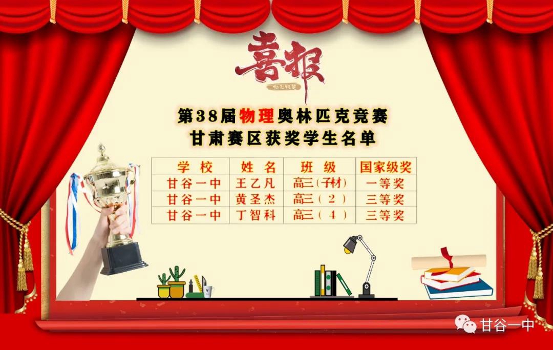 奥赛传捷报,桃李竞芬芳!近日,2021年度高中数学、物理、化学、生物四大学科奥林匹克竞赛成绩揭晓,甘谷一中参赛学子沉着应对,稳定发挥,喜获佳绩,再传捷报。通过激烈的预赛选拔,40余名进入决赛的学生中共有2人获得全国一等奖,11人获得全国二等奖,13人获得全国三等奖,1人获得省级一等奖。其中高三子材班学生王乙凡获得物理竞赛全国一等奖、省级一等奖,高三(1)班学生王子凡在生物竞赛中名列全省第11名,获得全国一等奖。