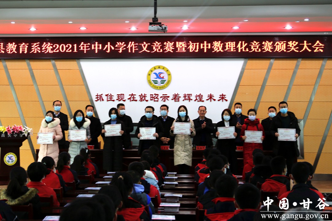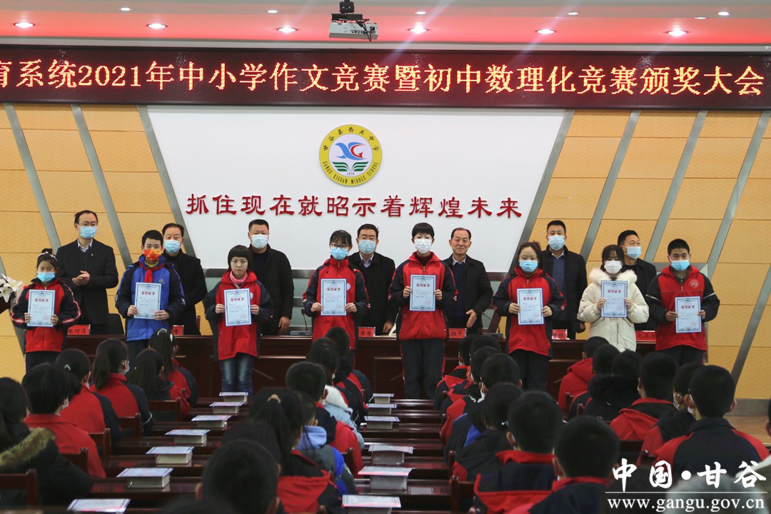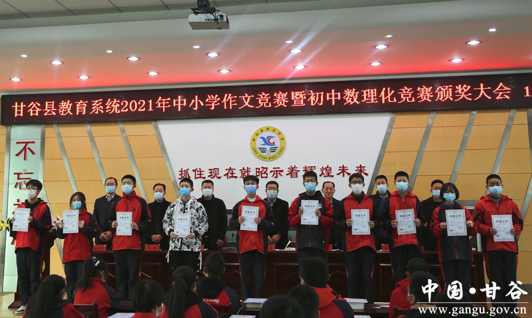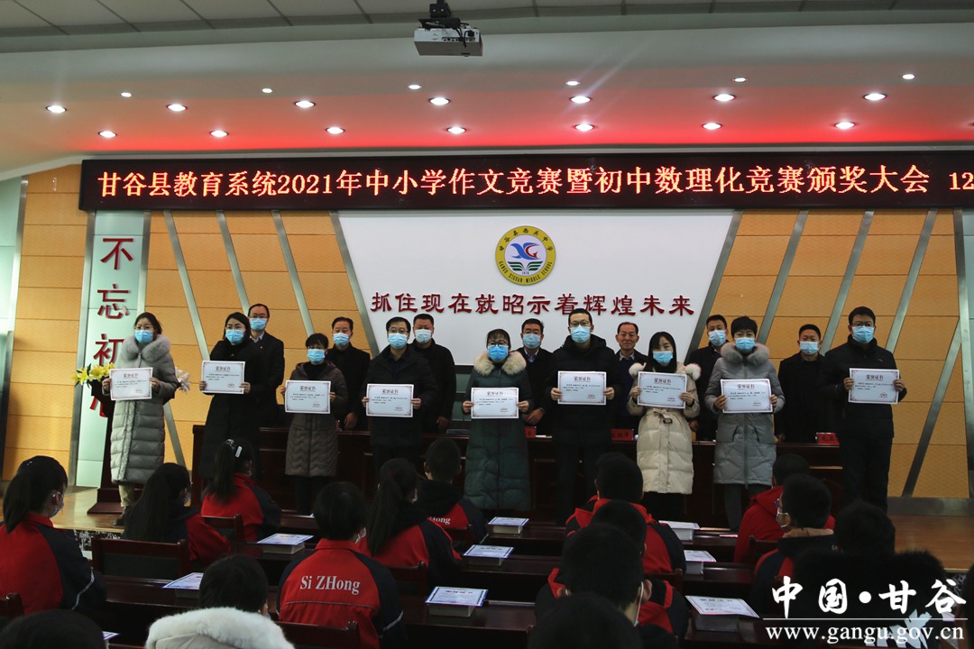 12月26日,甘谷县教育局召开2021年作文竞赛暨初中数理化竞赛颁奖大会,对在2021年全县中小学中文竞赛中获奖的102名学生、2021年全县数理化学科竞赛中获奖的64名学生及其指导教师进行了表彰。县教育局领导班子成员,各高中阶段学校分管领导,各学区、县直义务教育阶段学校校长,学科竞赛获奖学生代表和指导教师代表,共计70余人参加了颁奖大会。