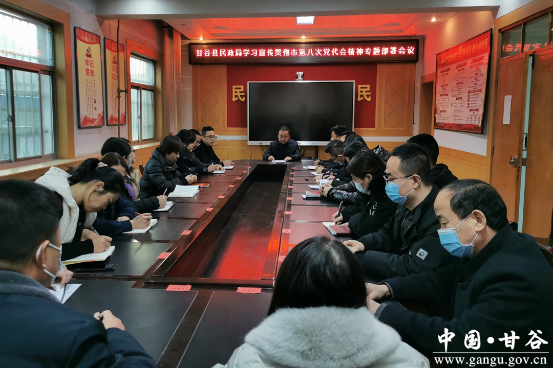 12月24日,甘谷县民政局党组书记、局长丁宇鸿主持召开会议,专题传达学习天水市第八次党代会精神,并就贯彻落实作出安排部署。