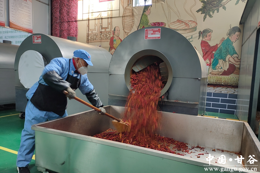 在陇上椒加工车间一派繁忙景象,工人们正在对干辣椒进行分拣、烘炒、粉碎、包装,制成不同的辣椒产品,以满足市场需求。陇上椒集团采取线上线下销售模式,全面拓宽销售渠道,通过多层面整合甘谷辣椒文化资源,打造了独属于甘谷的“辣椒形象”。
