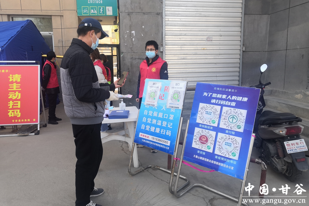 疫情发生以来,甘谷县水务局安排60余名干部职工,在包片责任区域杨场安居小区24小时轮流值守,做好出入登记、测温等工作,劝导居民严格遵守防疫出行规定,并积极配合社区做好外地返甘人员健康码及核酸检测证明查验、报备、居家健康观察等工作,筑牢了基层防疫安全网。