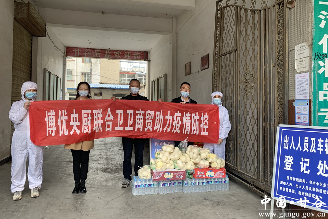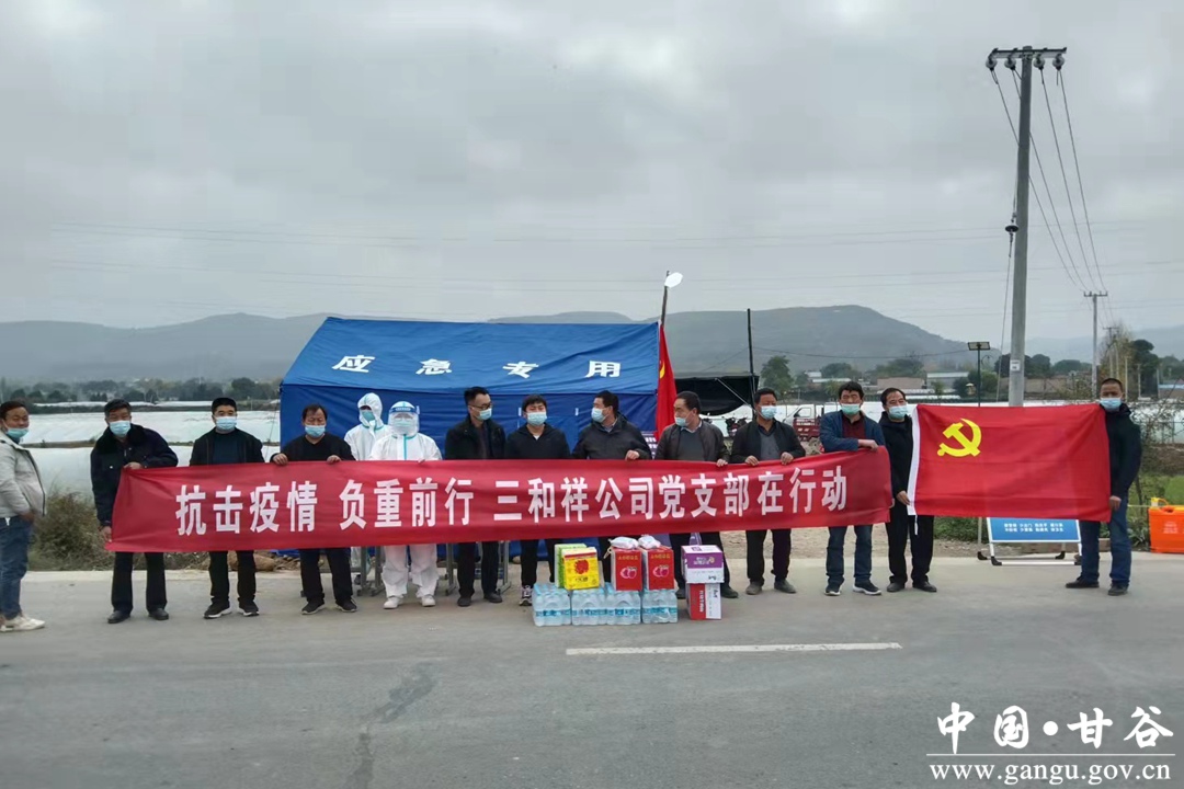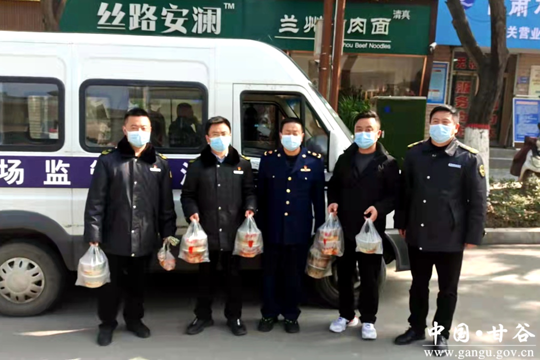 天水三和祥果蔬批发有限公司向磐安高速路口,磐安燕家庄村疫情防控执勤点,磐安西桥头检测点捐赠价值四千余元的方便面,矿泉水,苹果等物资。甘谷靓丽广告公司向县市场监督管理局5个社区疫情防控执勤点捐赠价值两千余元的取暖设备等物资。甘谷县博优中央厨房有限公司向县市场监管局社区疫情防控执勤点捐赠价值两千余元的矿泉水,方便面,馒头、榨菜等物资。甘谷县丝路安澜牛肉面馆、甘谷县爱的礼物蛋糕店向县市场监督管理局加班值勤人员免费提供爱心午餐和面包糕点。