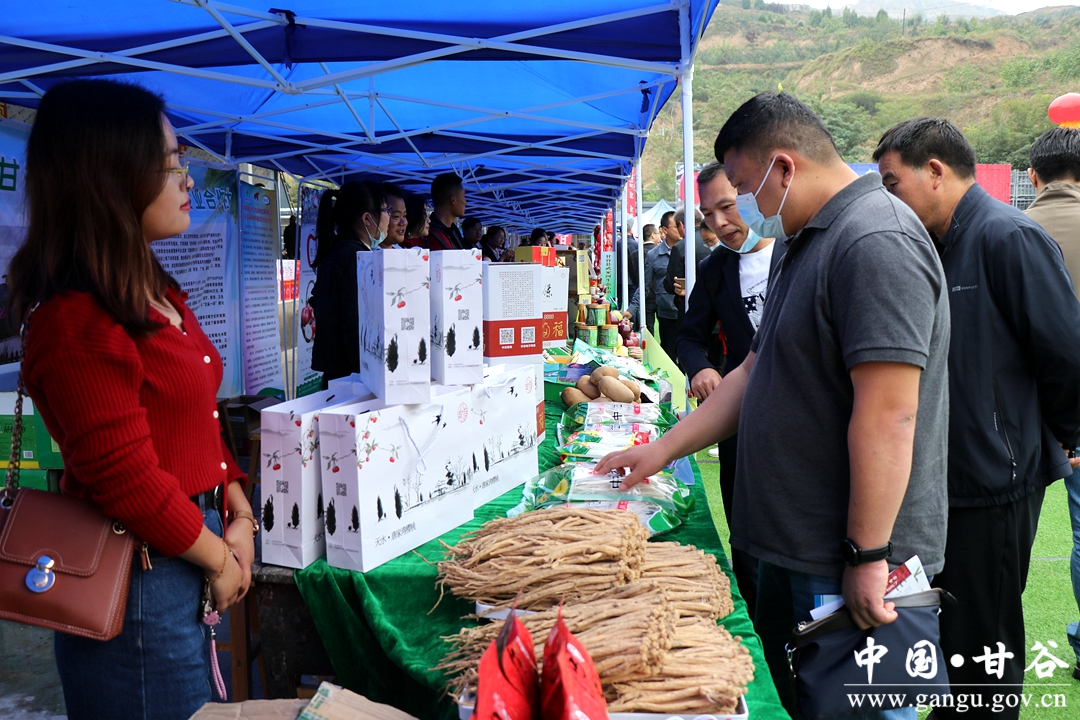 记者在甘谷县大庄镇展区看到,摆满展台的农特产品吸引着各方宾客,有前来参观品尝的,有现场选购的,也有洽谈合作的。