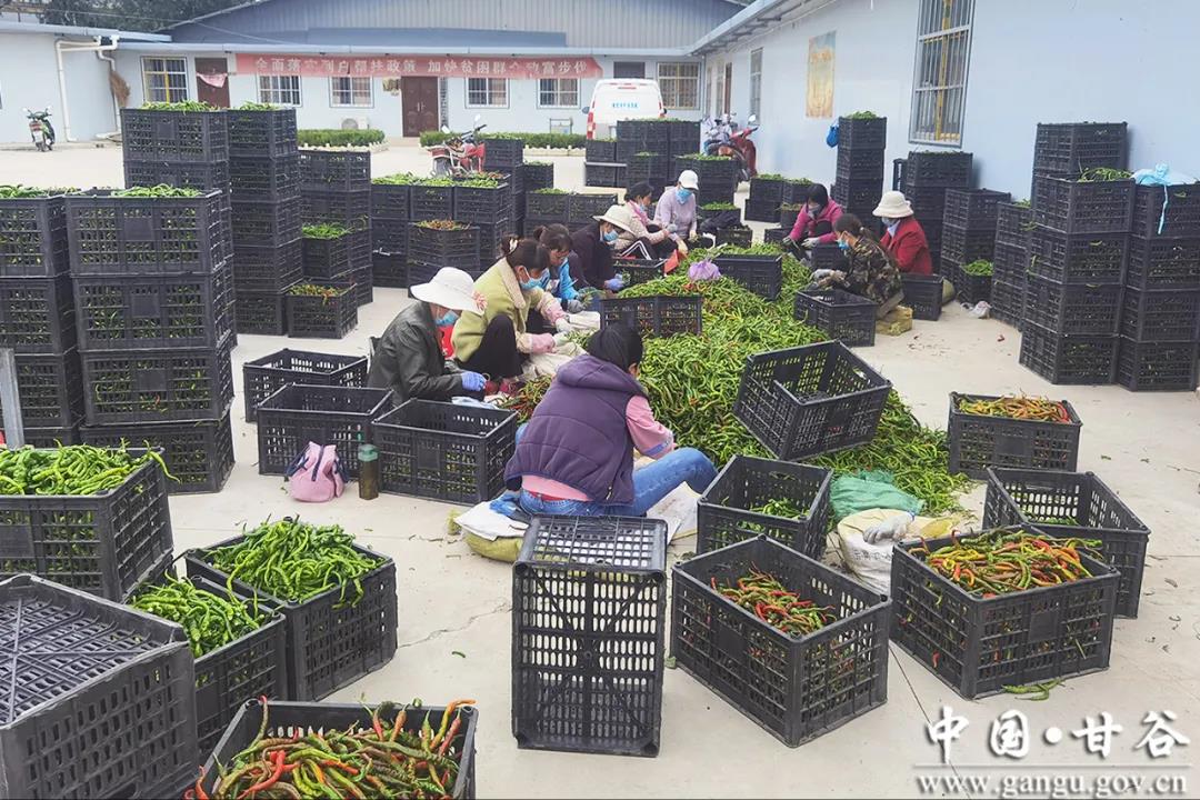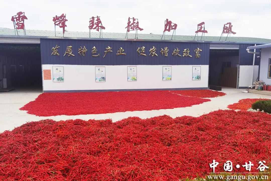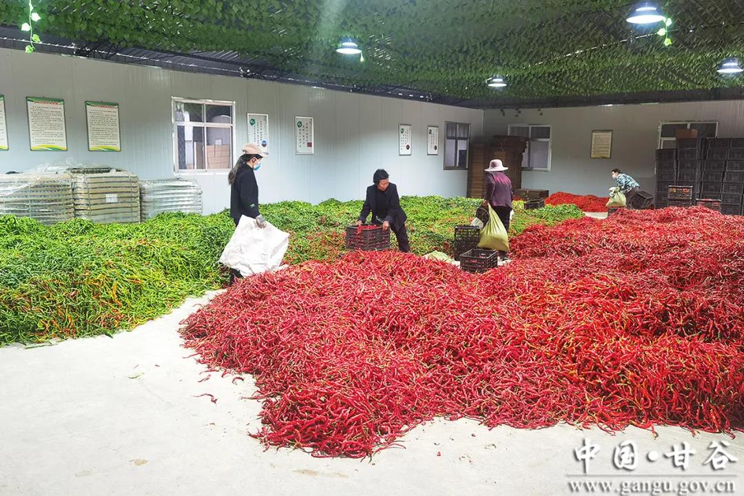 按照“党建引领,合作社带动,农户参与”的共营模式,辣椒销售以甘谷县泓峰果业种植农民专业合作社为载体,前期合作社与村集体签订收购合同,与农户签订辣椒保底收购协议,将丰收后的辣椒进行收购、加工和销售,主要以辣椒的烘干、辣椒段、丝、面的加工和包装为主,通过“832平台”、直播、电商等渠道,直销省内外。