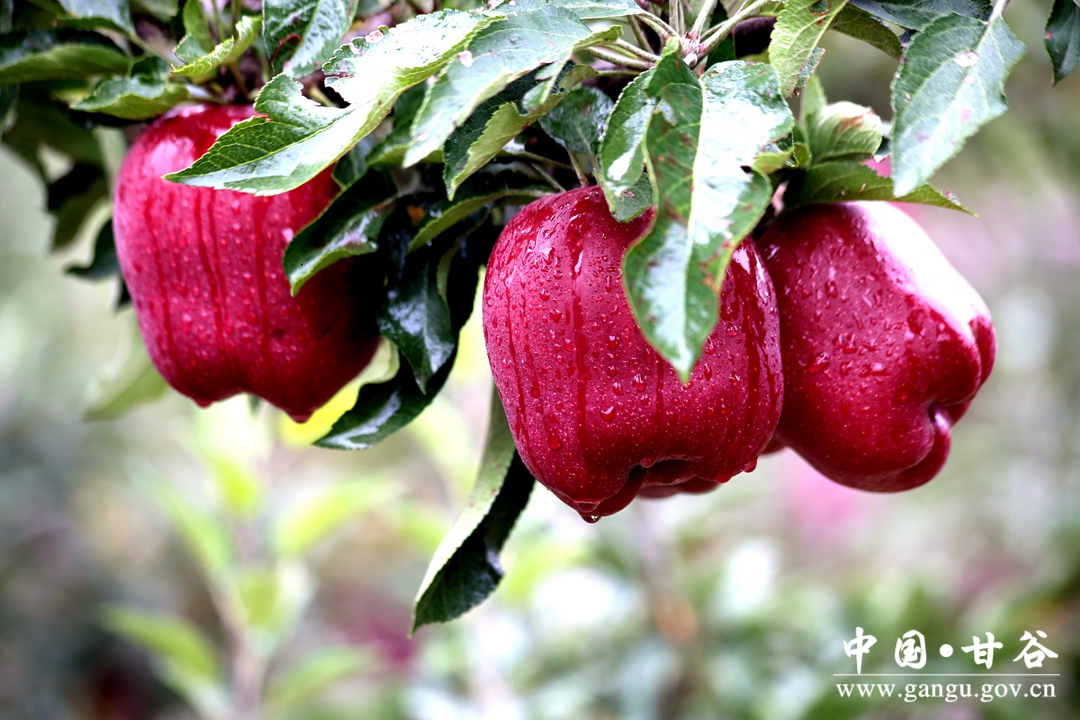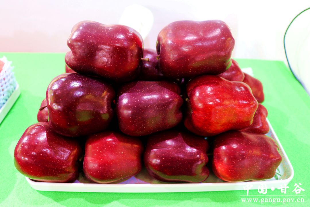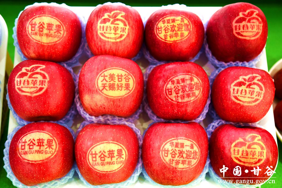 甘谷花牛苹果,果面红黑透亮,果型端正高桩,果肉脆甜多汁,果香浓郁芬芳,硬度适中,香甜可口,是天水花牛苹果中的精品,先后被评为“农业部优质农产品”、“甘肃省优质农产品”、“深圳国际水果鉴评会水果状元”、“中华名果”、“中国名优产品金奖”、“中国名优果品金质奖”等多项荣誉称号。目前,全县苹果面积36万亩,年产量60万吨以上,建有国家级苹果标准园1个,省级苹果标准园14个,完成苹果商标注册54个、苹果绿色认证9个。