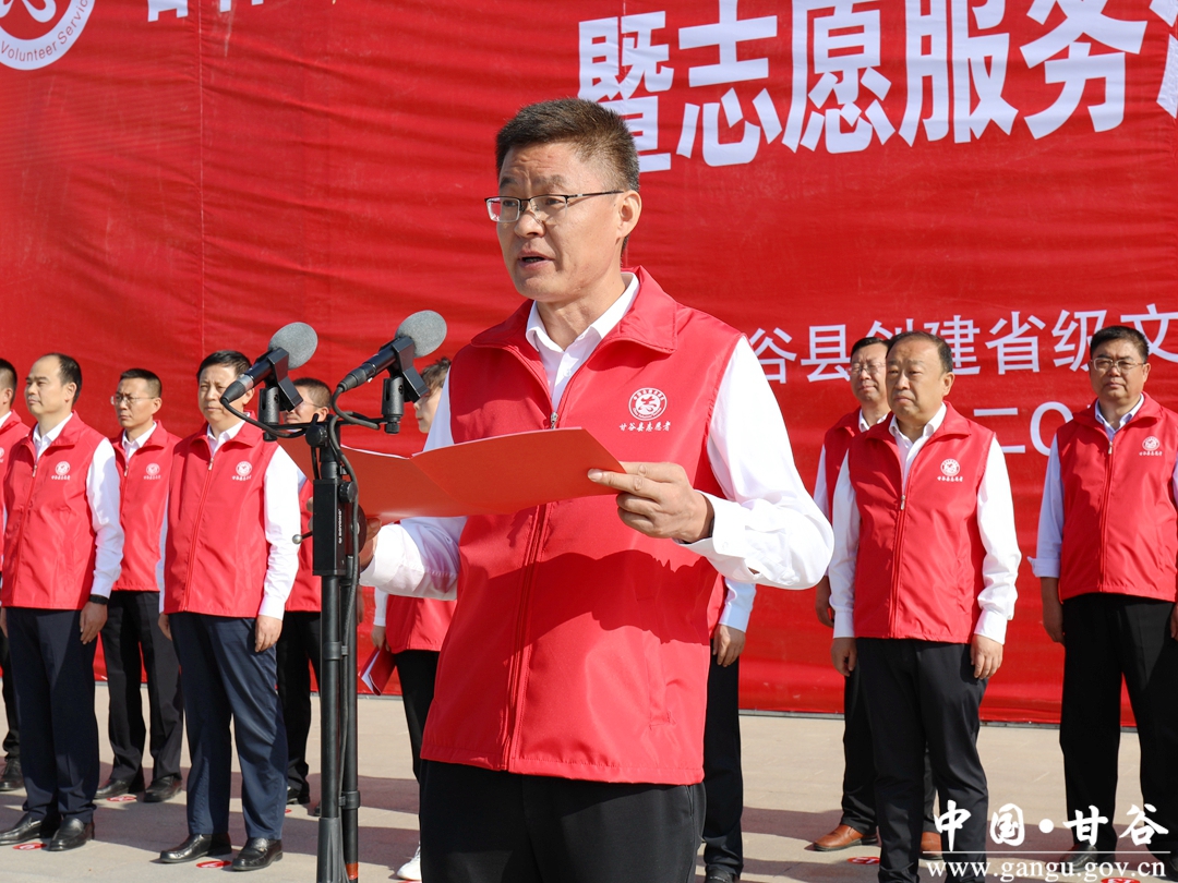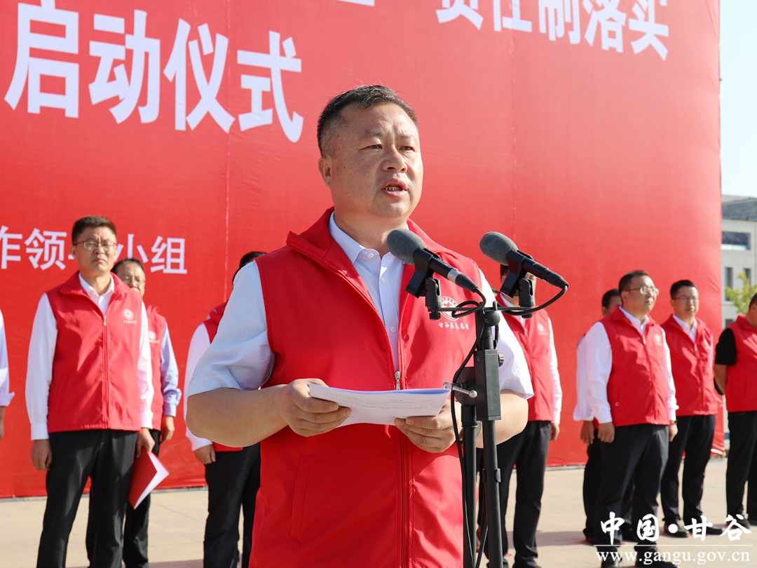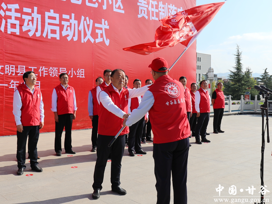 县委书记吴健为部门单位代表授志愿服务队队旗并宣布活动正式启动;县委副书记、代县长孙忠平作动员讲话;县委常委、副县长王明宣读《中共甘谷县委办公室 甘谷县人民政府办公室,关于建立“包街包巷包小区责任制”,常态长效推进省级文明县创建工作的通知》;县委常委、宣传部部长王亚梅主持启动仪式。