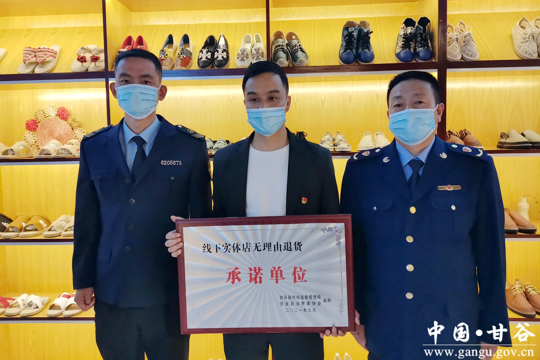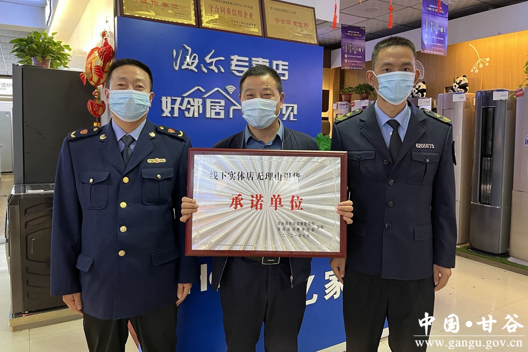 近日,甘谷县市场监督管理局为4家“线下实体无理由退货”承诺单位上门颁发公示牌。